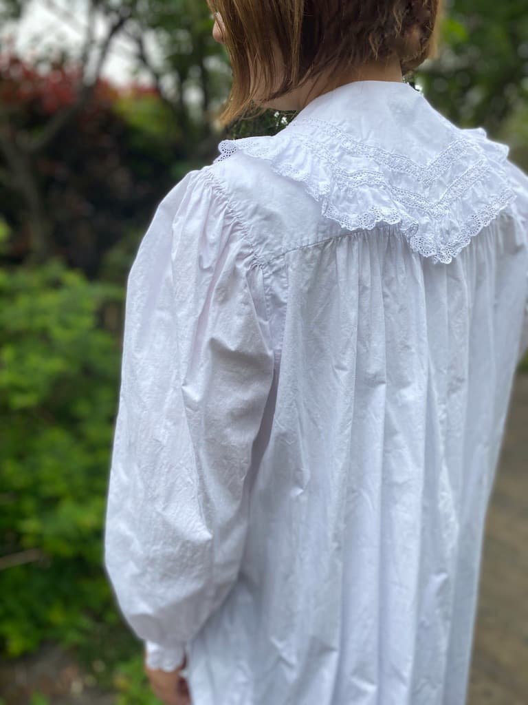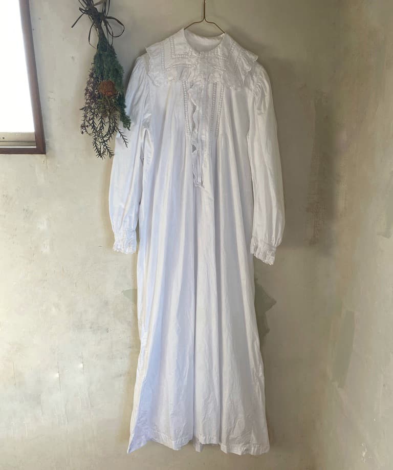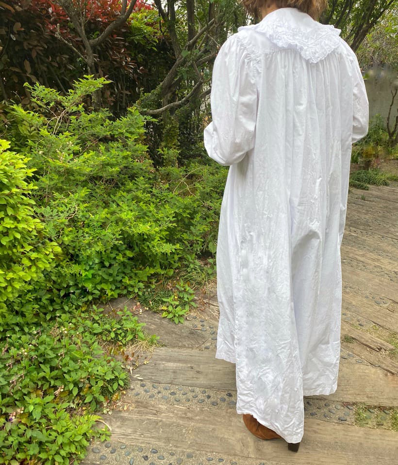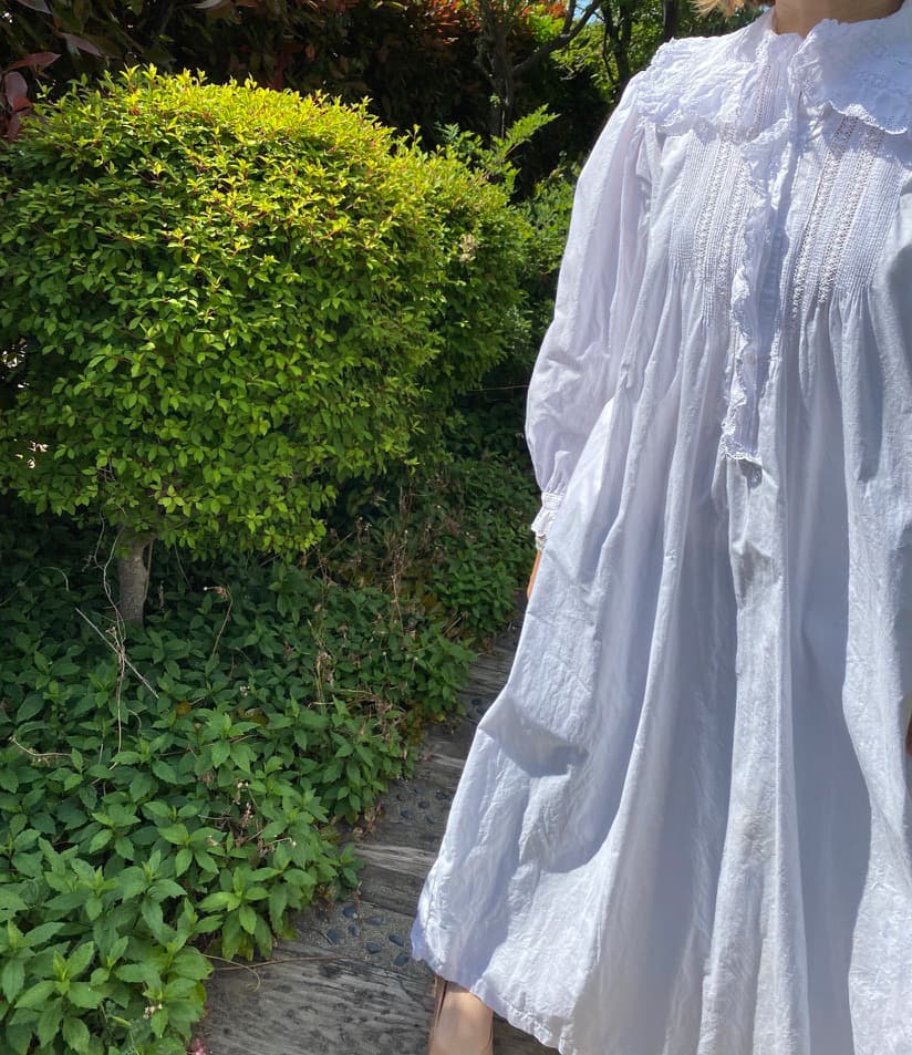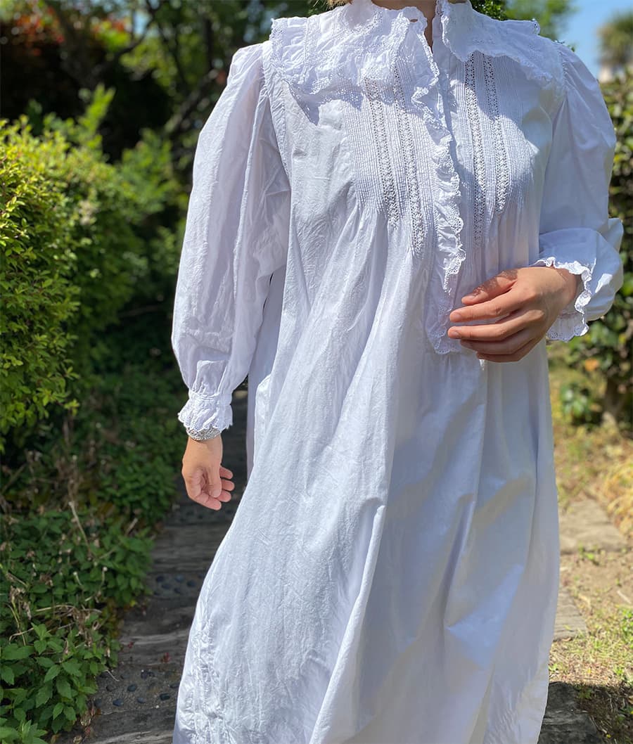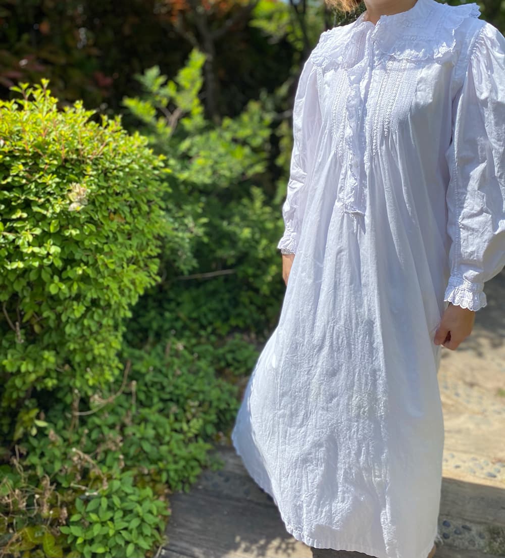 大きなスカラップレースの襟とフロントにぎっしり施されたピンタックがポイントのアンティークワンピース。後ろ姿もとびきり可愛い豪華な一枚です。