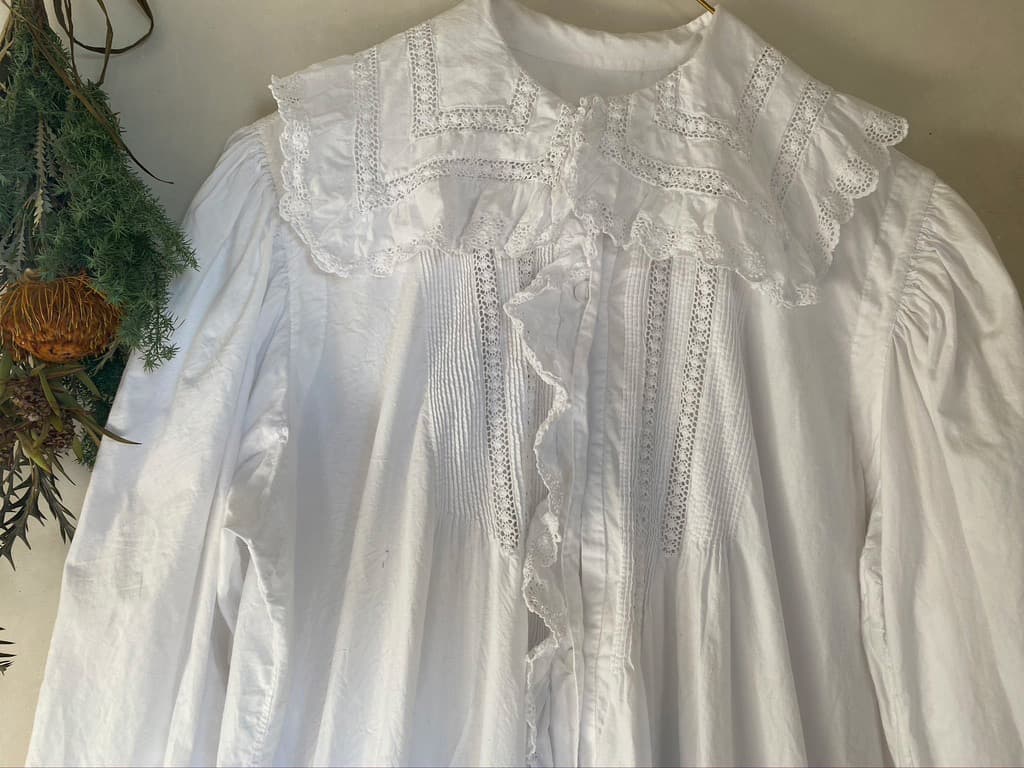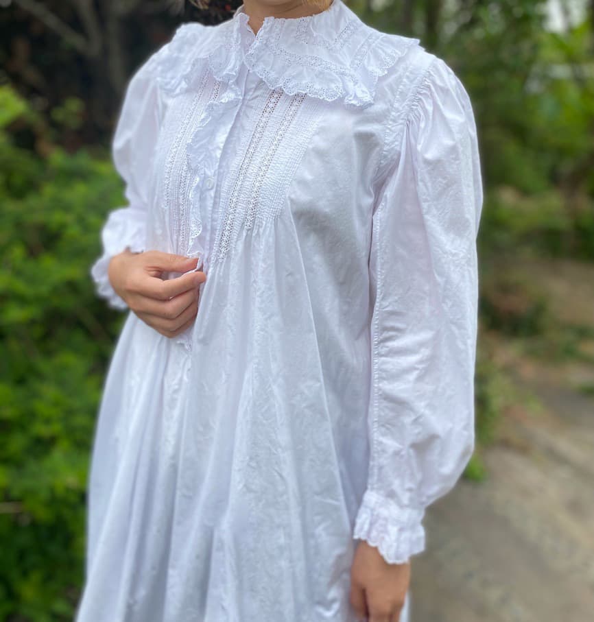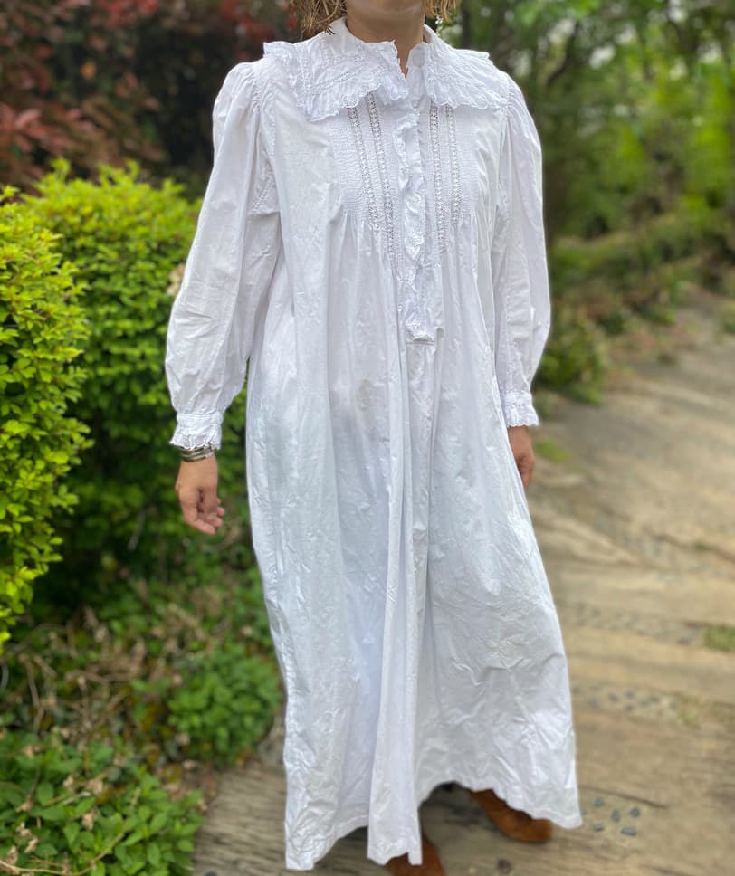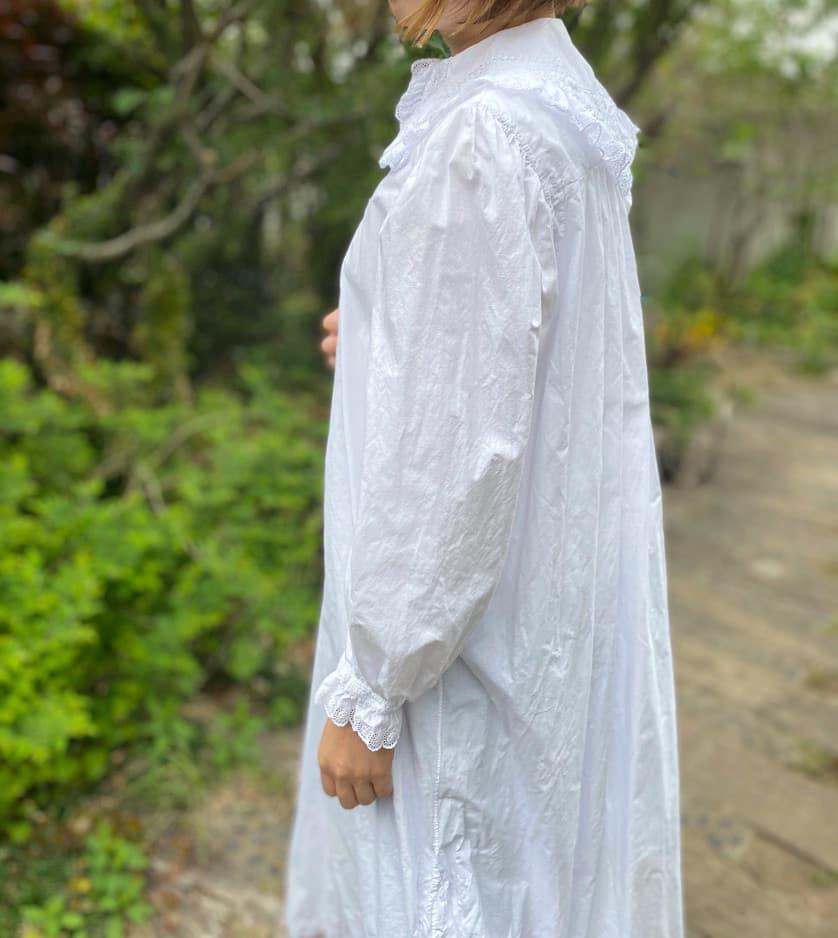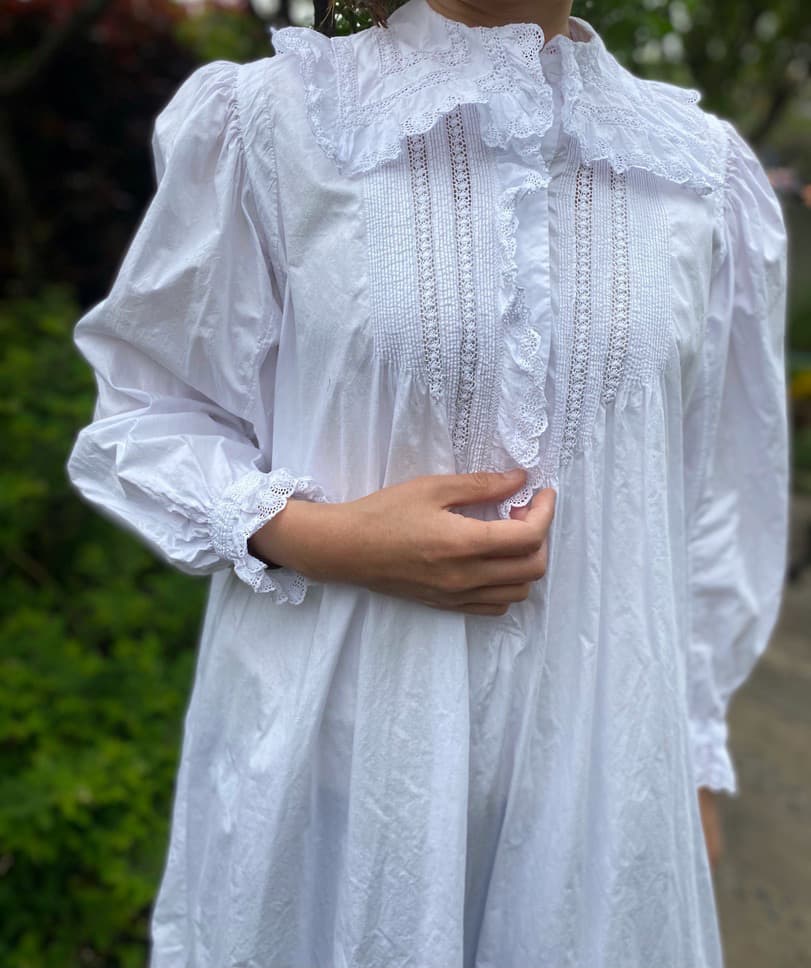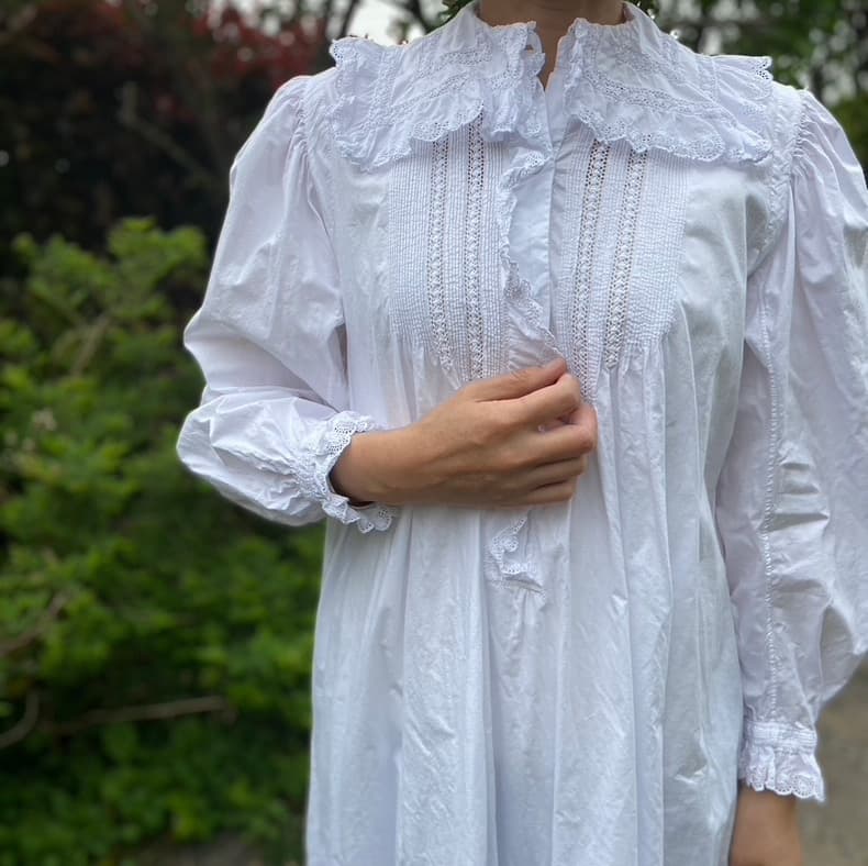 大きなスカラップレースの襟とフロントにぎっしり施されたピンタックがポイントのアンティークワンピース。後ろ姿もとびきり可愛い豪華な一枚です。