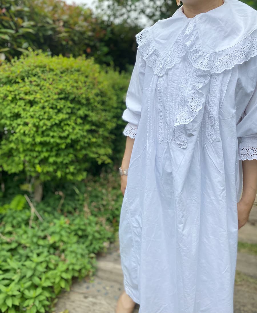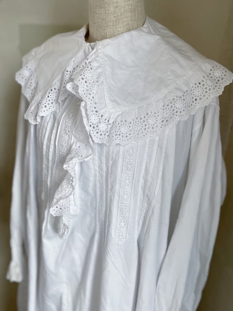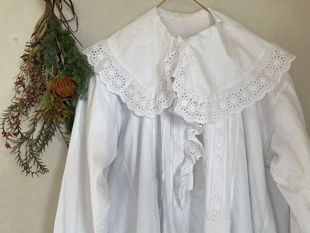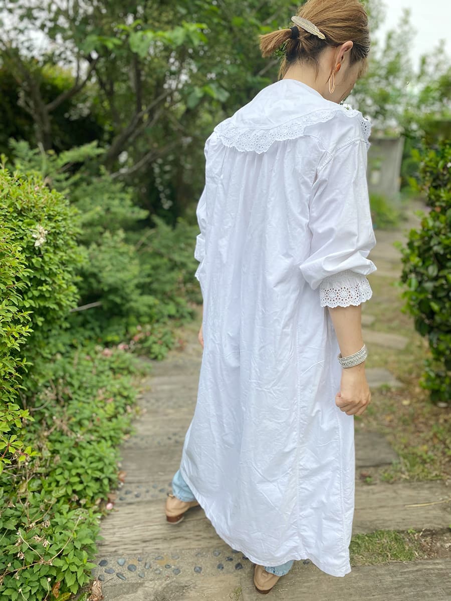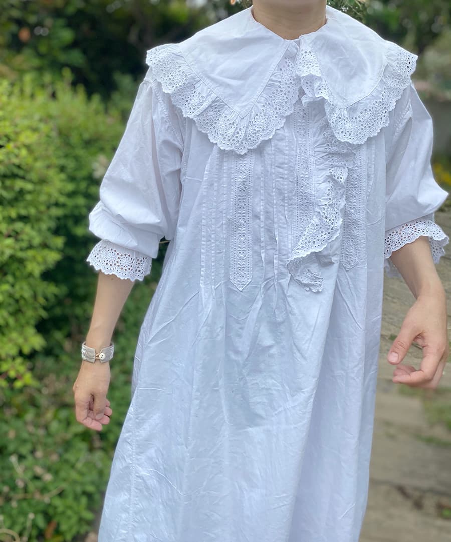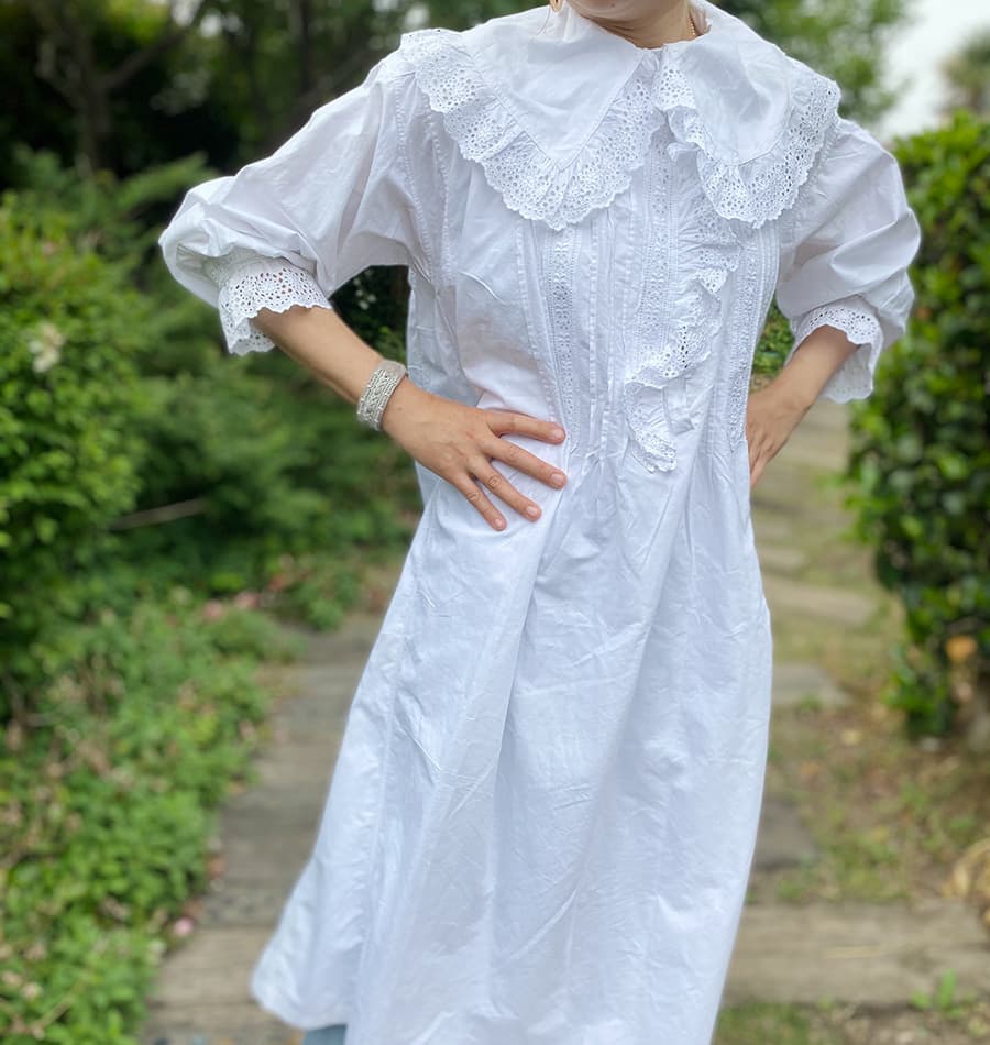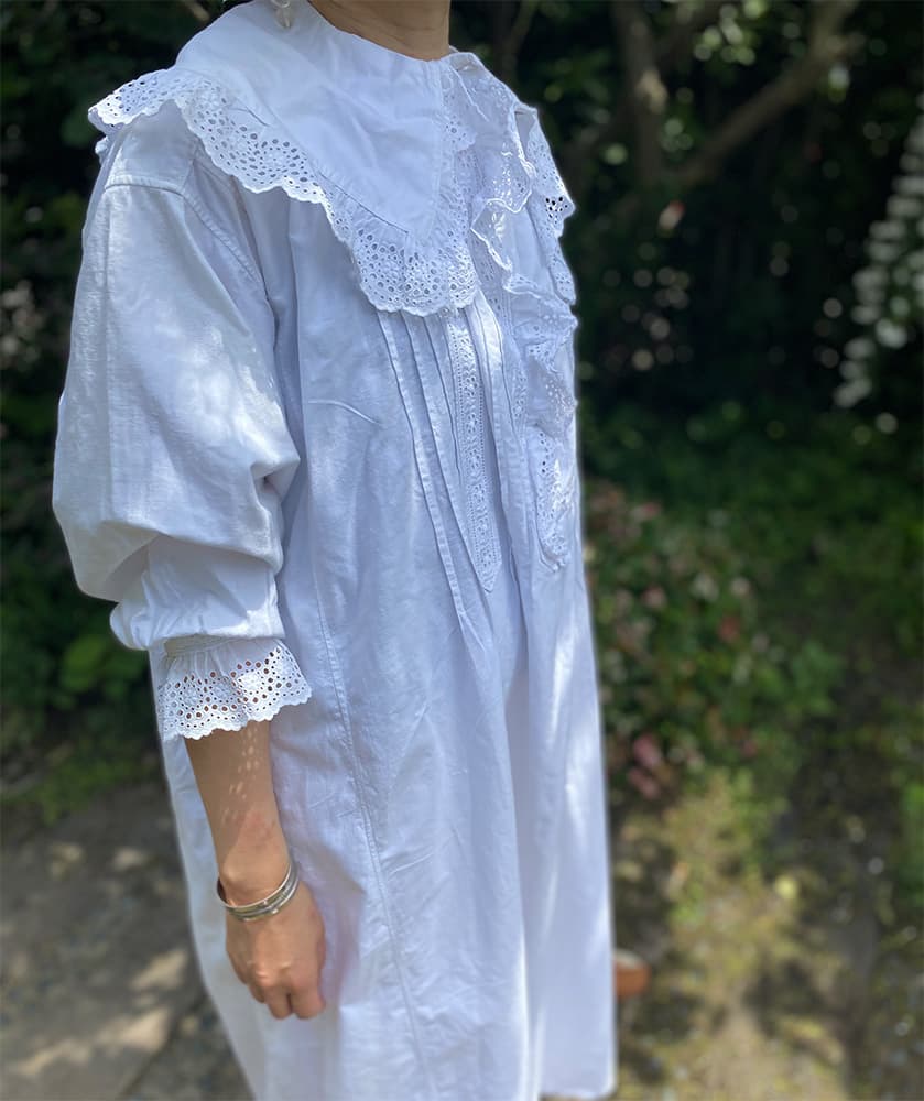 襟とフロント部分にもたっぷりとレースが施されており、とても豪華なデザイン。しっかりしたコットン生地なので、一枚でさらっと着るのはもちろん、寒い時期はニットやジャケットなどと重ね着して大きな襟を見せたり、通年を通してスタイリングを楽しんでいただけるスペシャルな一枚です。