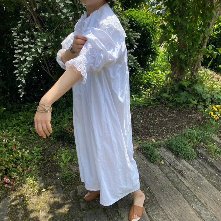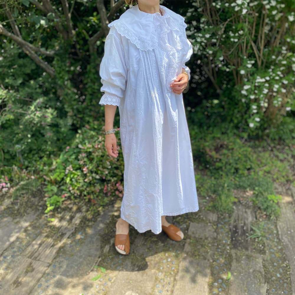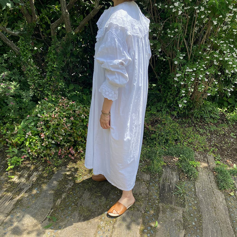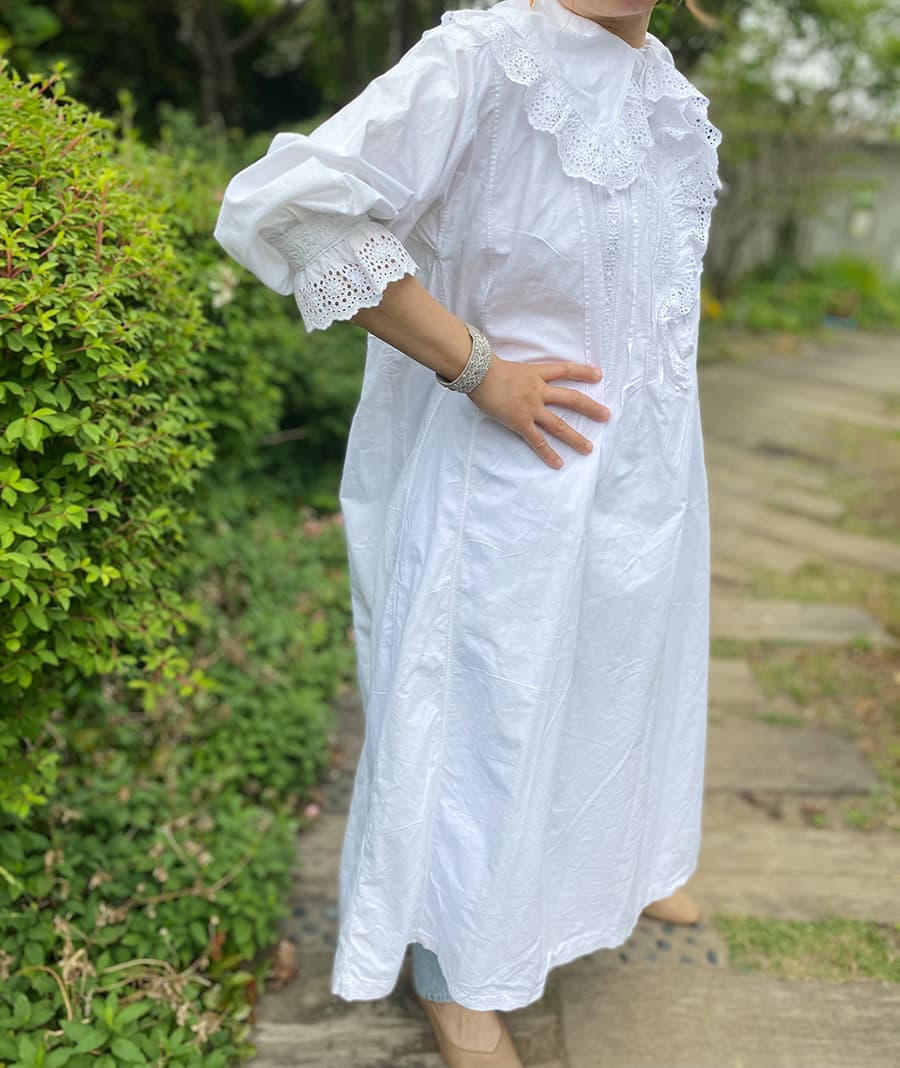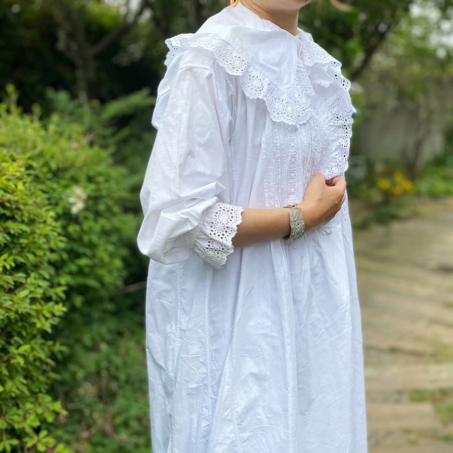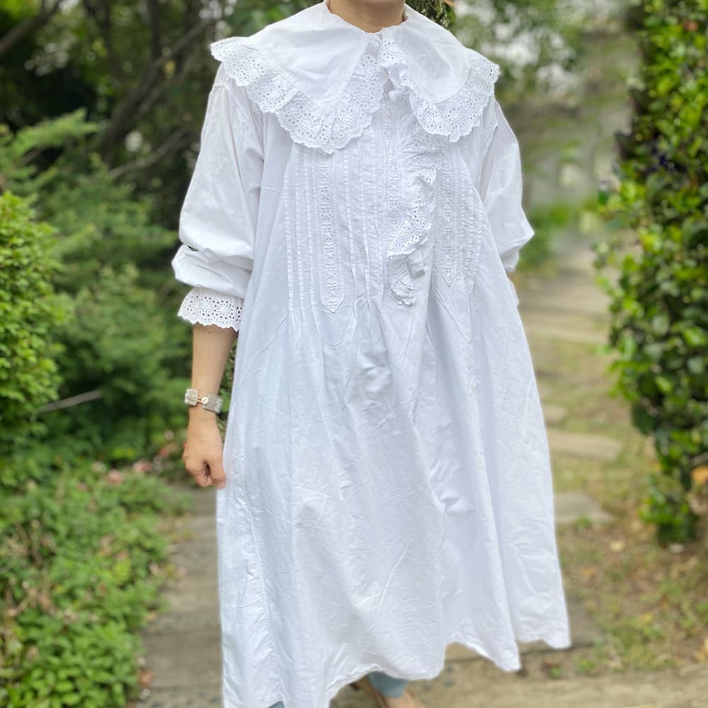 襟とフロント部分にもたっぷりとレースが施されており、とても豪華なデザイン。しっかりしたコットン生地なので、一枚でさらっと着るのはもちろん、寒い時期はニットやジャケットなどと重ね着して大きな襟を見せたり、通年を通してスタイリングを楽しんでいただけるスペシャルな一枚です。