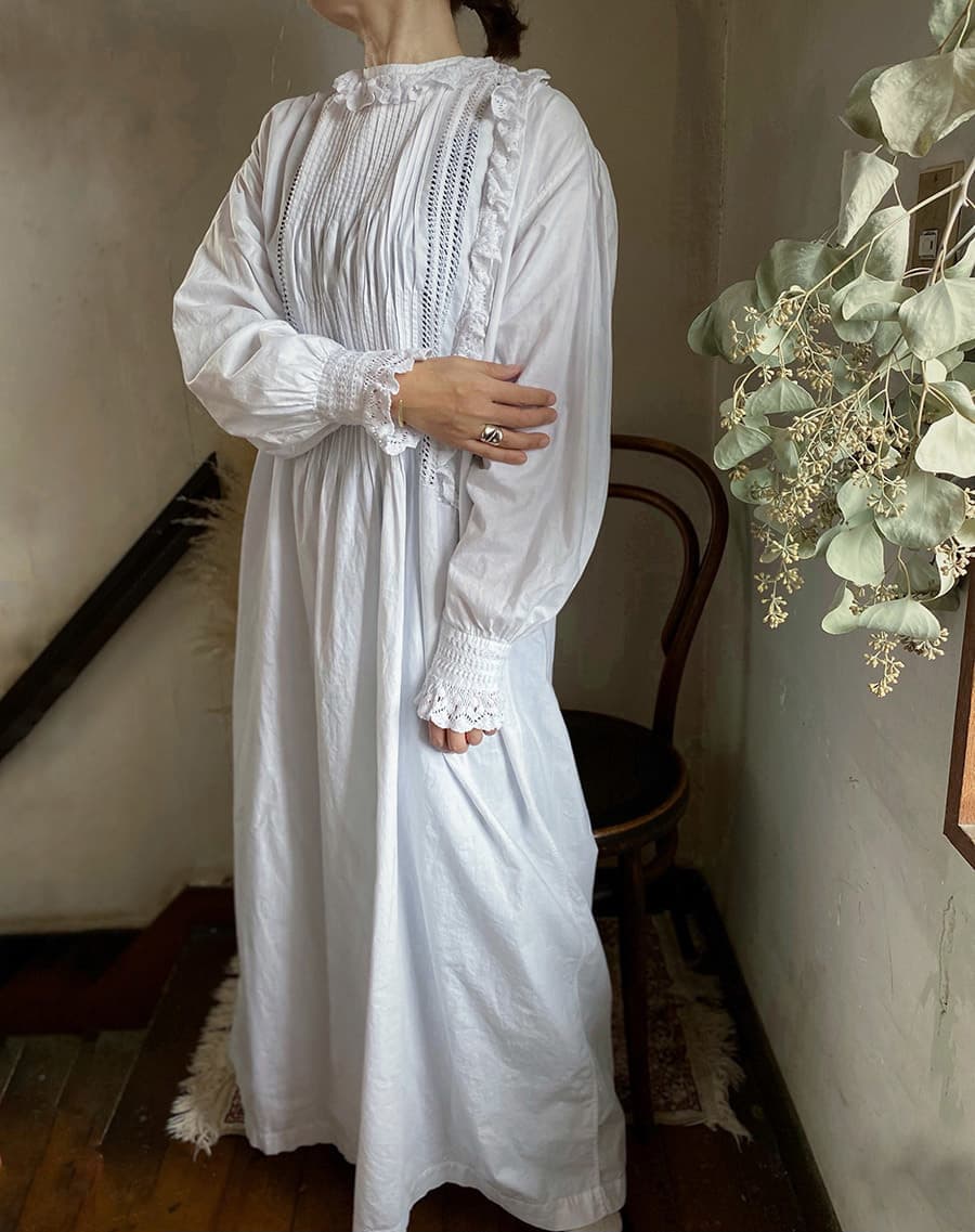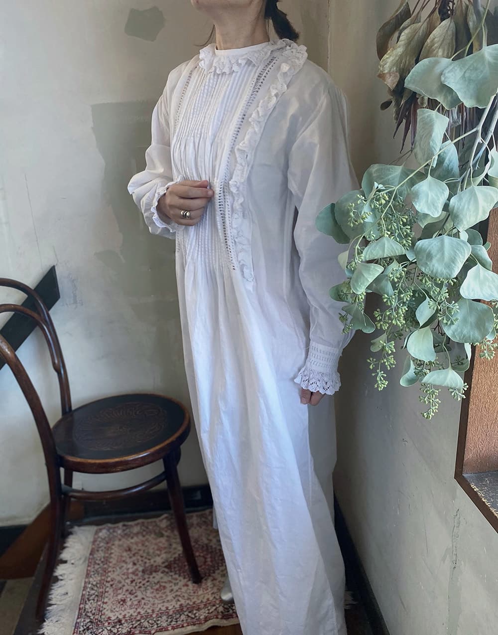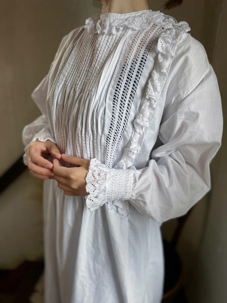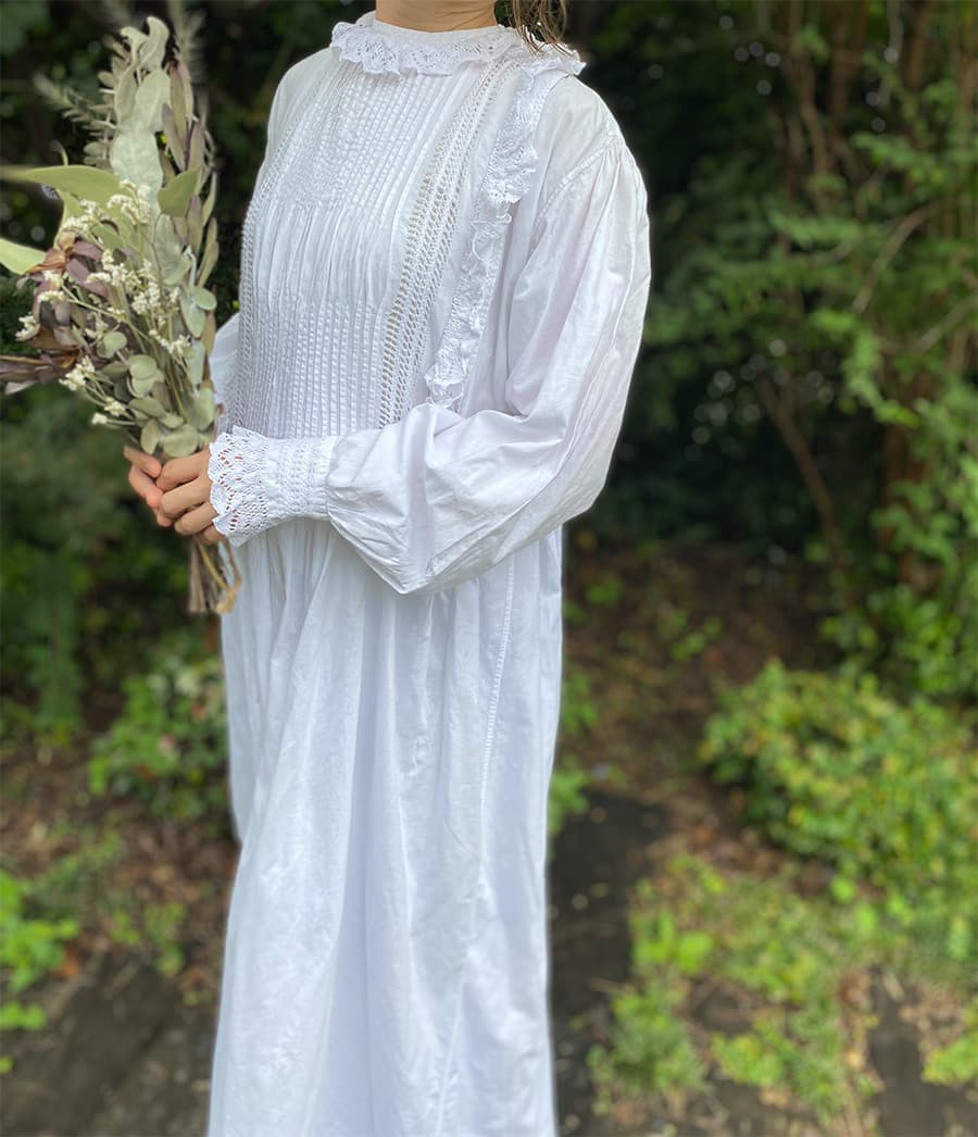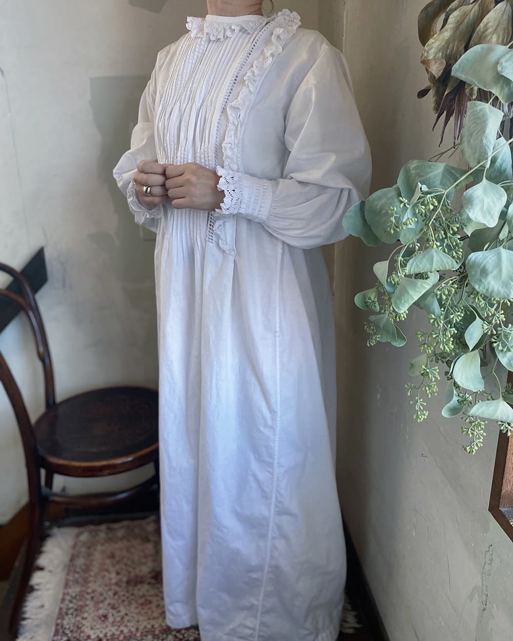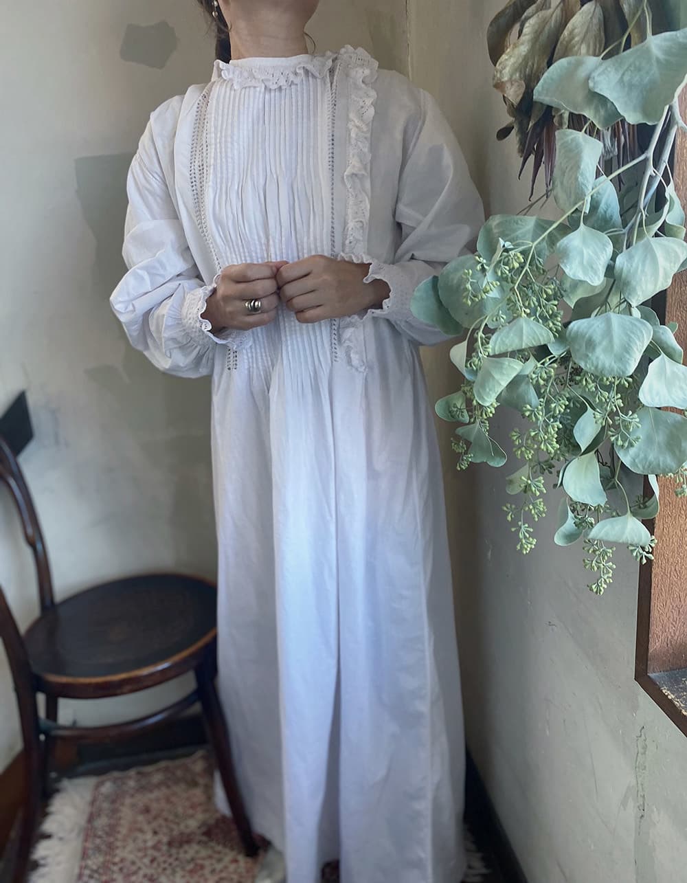 1900年代のアンティークコットンワンピース。非常に細かいピンタックがフロント部分にぎっしり施されており、襟とお袖のレースも繊細で美しく、とても希少なデザインのドレスとなっております。