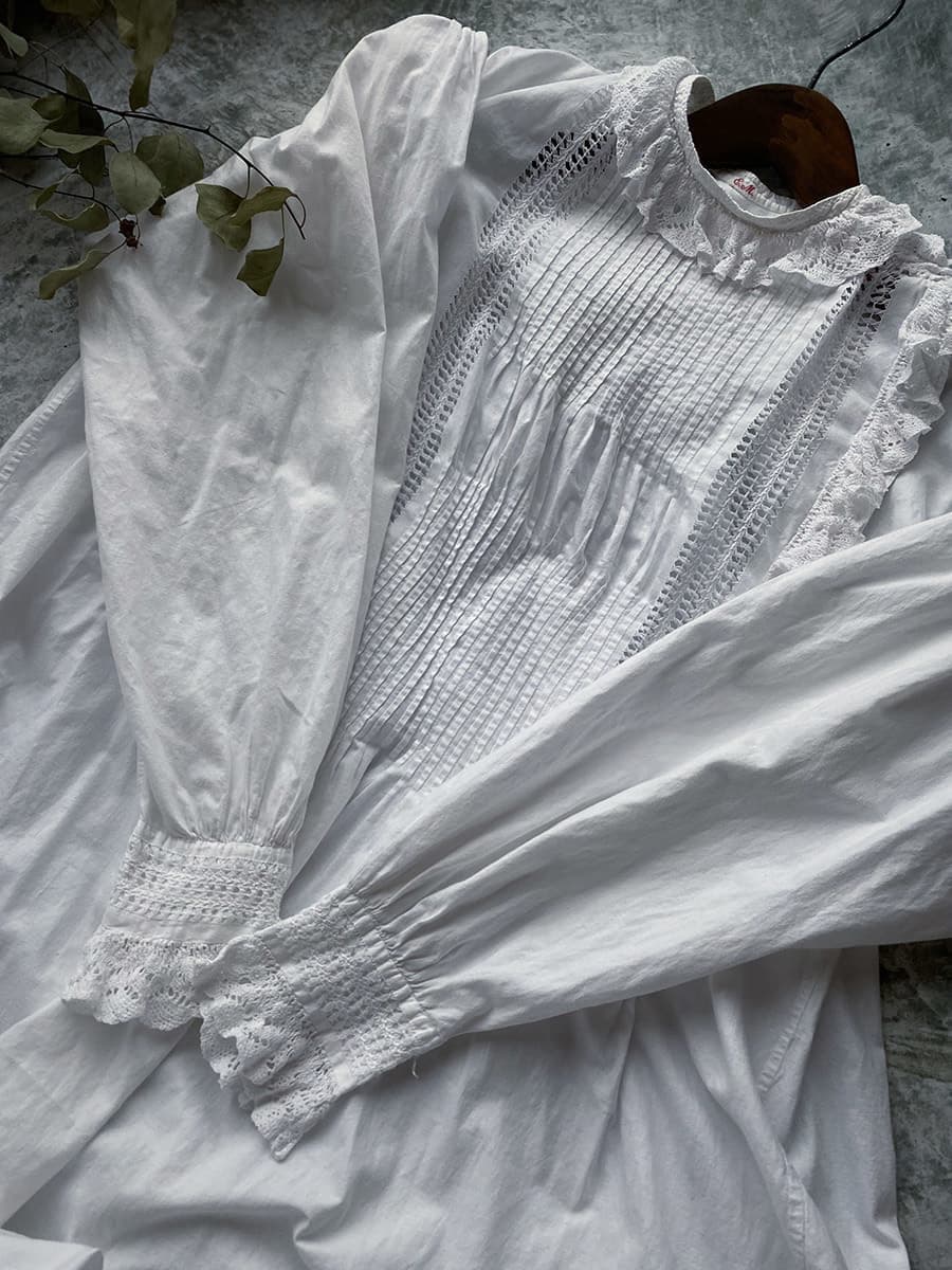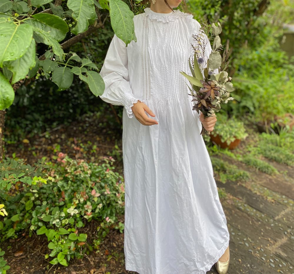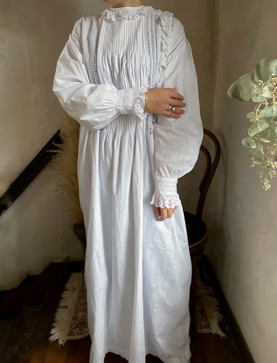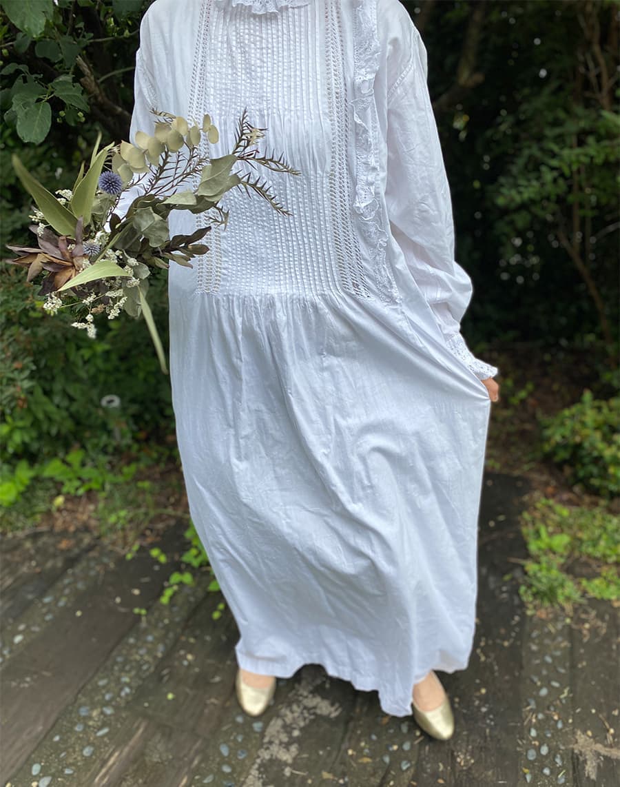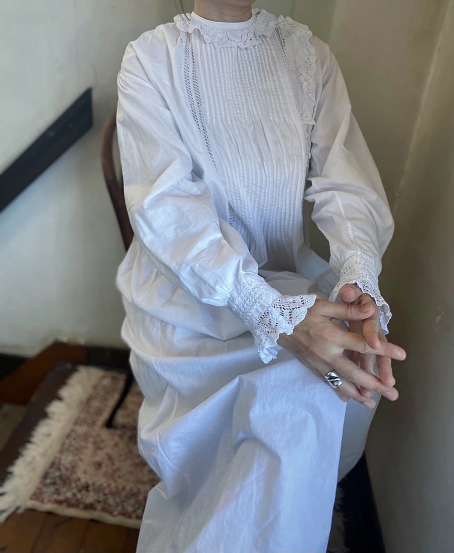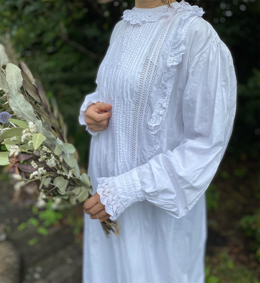 1900年代のアンティークコットンワンピース。非常に細かいピンタックがフロント部分にぎっしり施されており、襟とお袖のレースも繊細で美しく、とても希少なデザインのドレスとなっております。