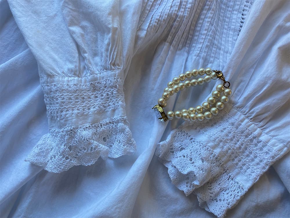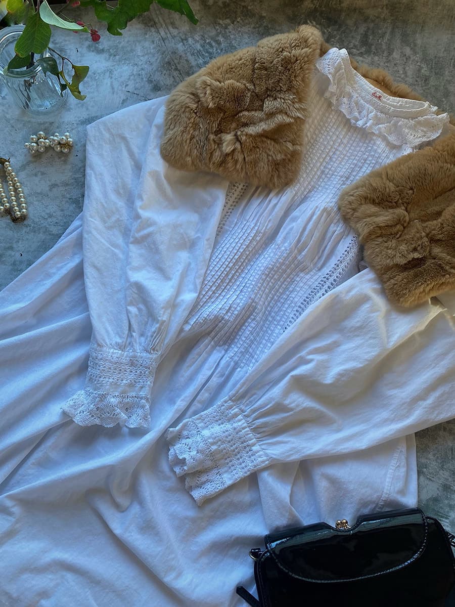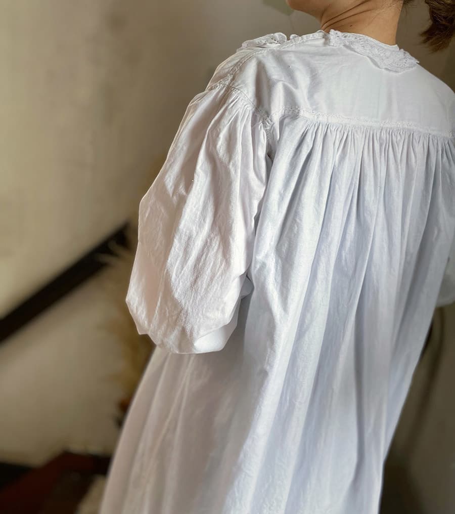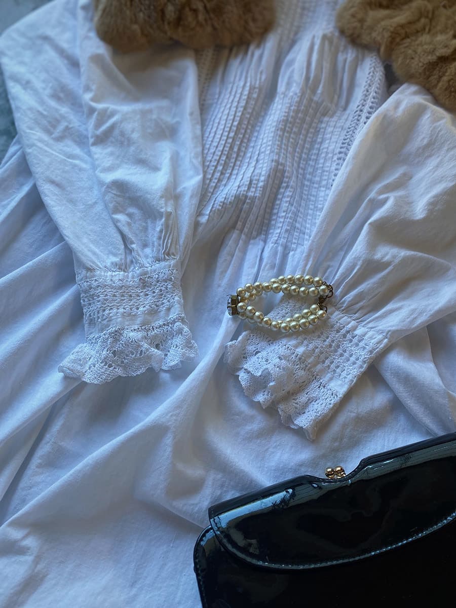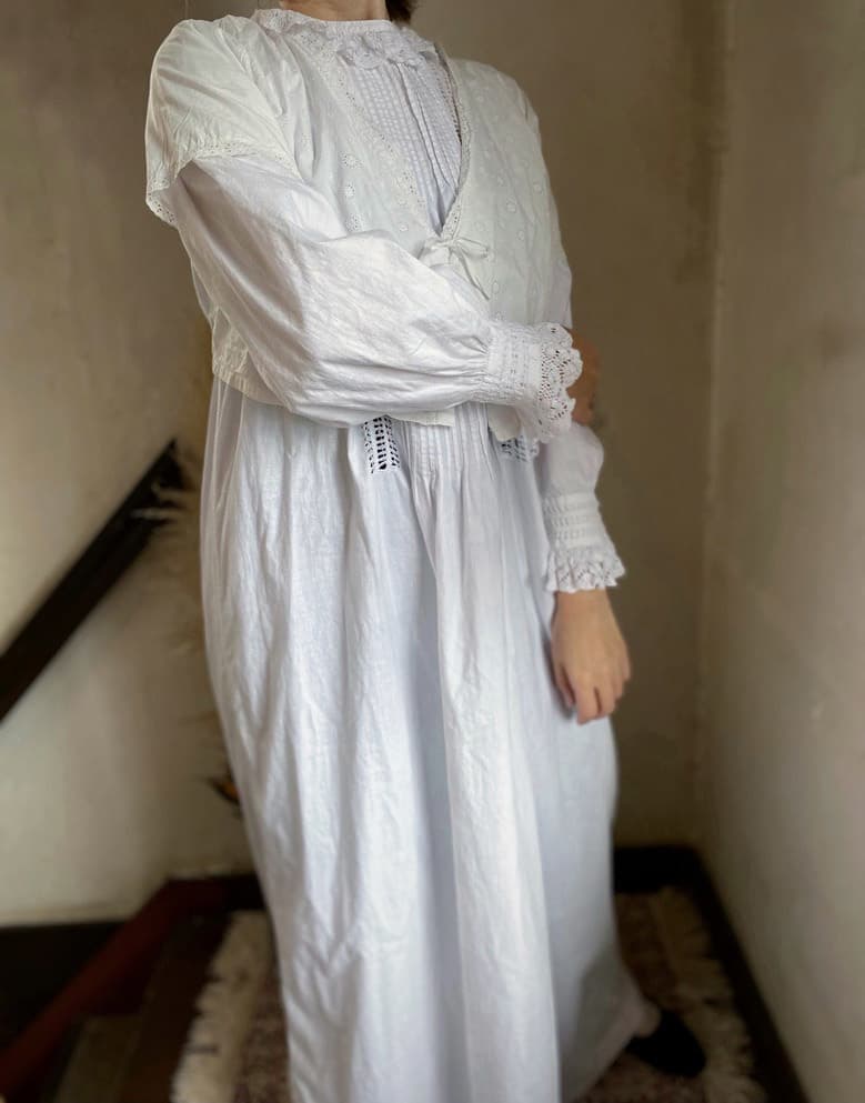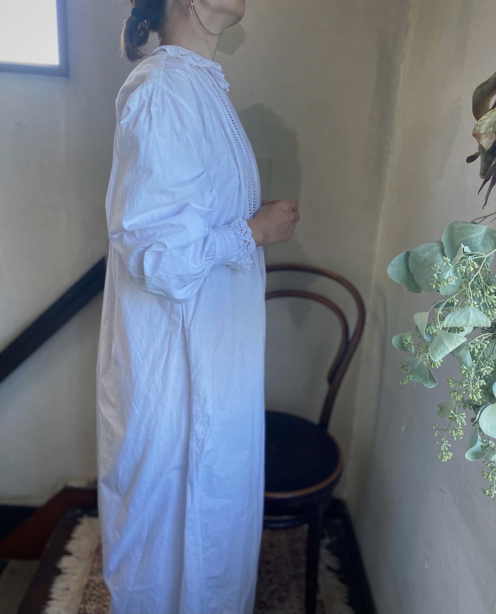 1900年代のアンティークコットンワンピース。非常に細かいピンタックがフロント部分にぎっしり施されており、襟とお袖のレースも繊細で美しく、とても希少なデザインのドレスとなっております。