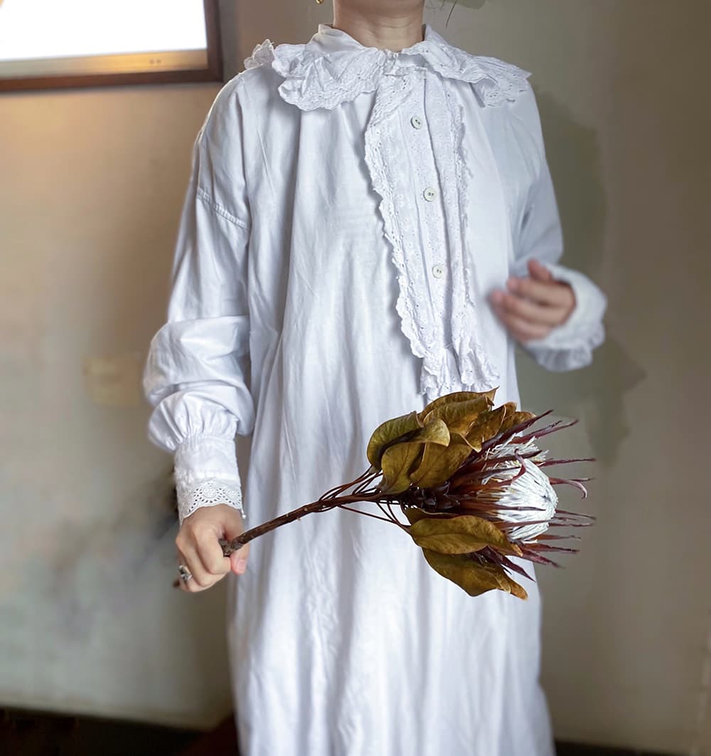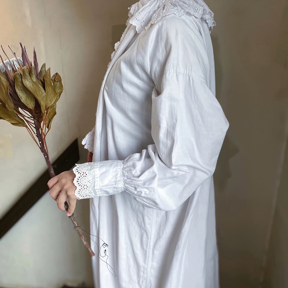 大きな襟とボタン周りやお袖の豪華なレースがポイント。小さなお花模様の刺繍もたっぷり施された、とても可愛らしいデザインのワンピースです。さらっと1枚で着ても、大きな襟を出して重ね着しても、コーディネートを楽しんでいただける1枚です。