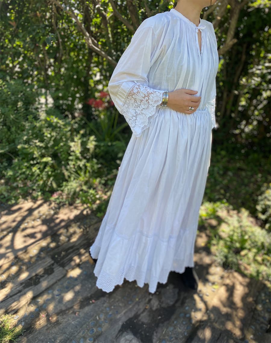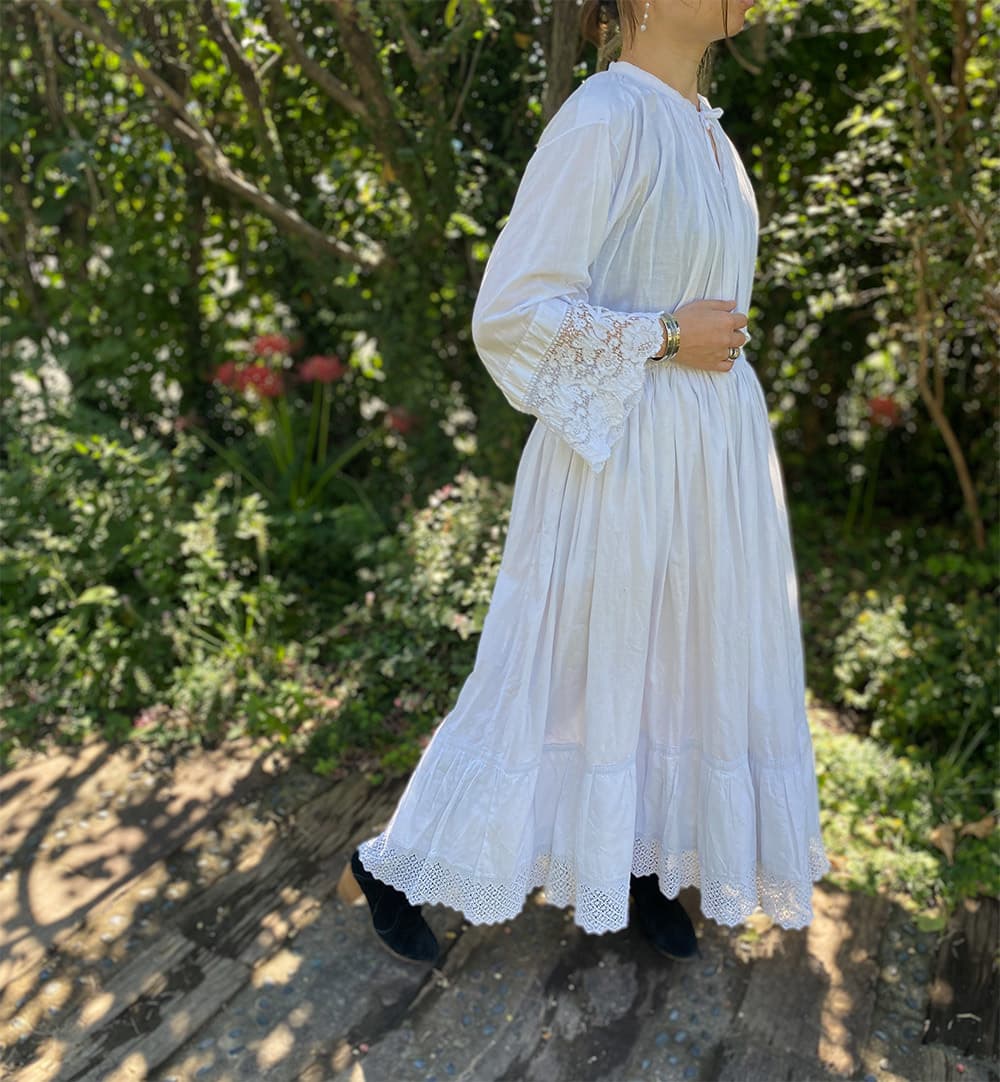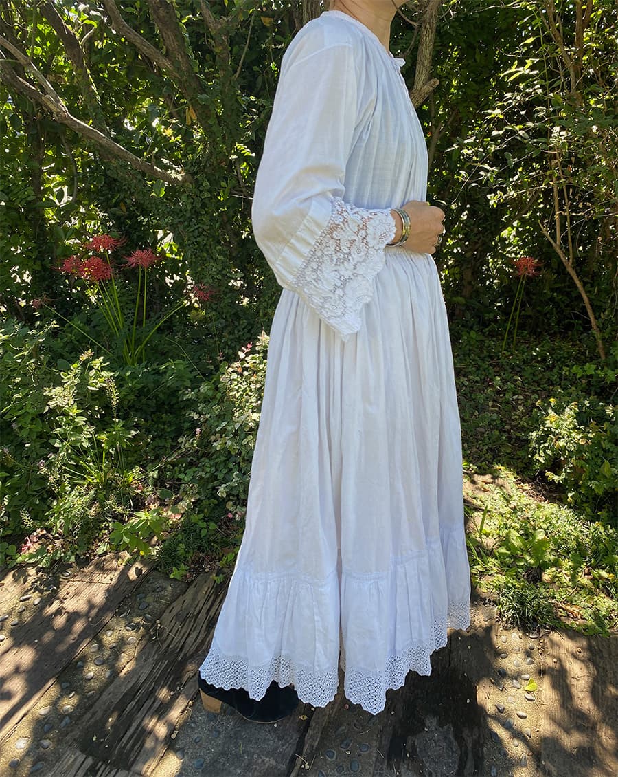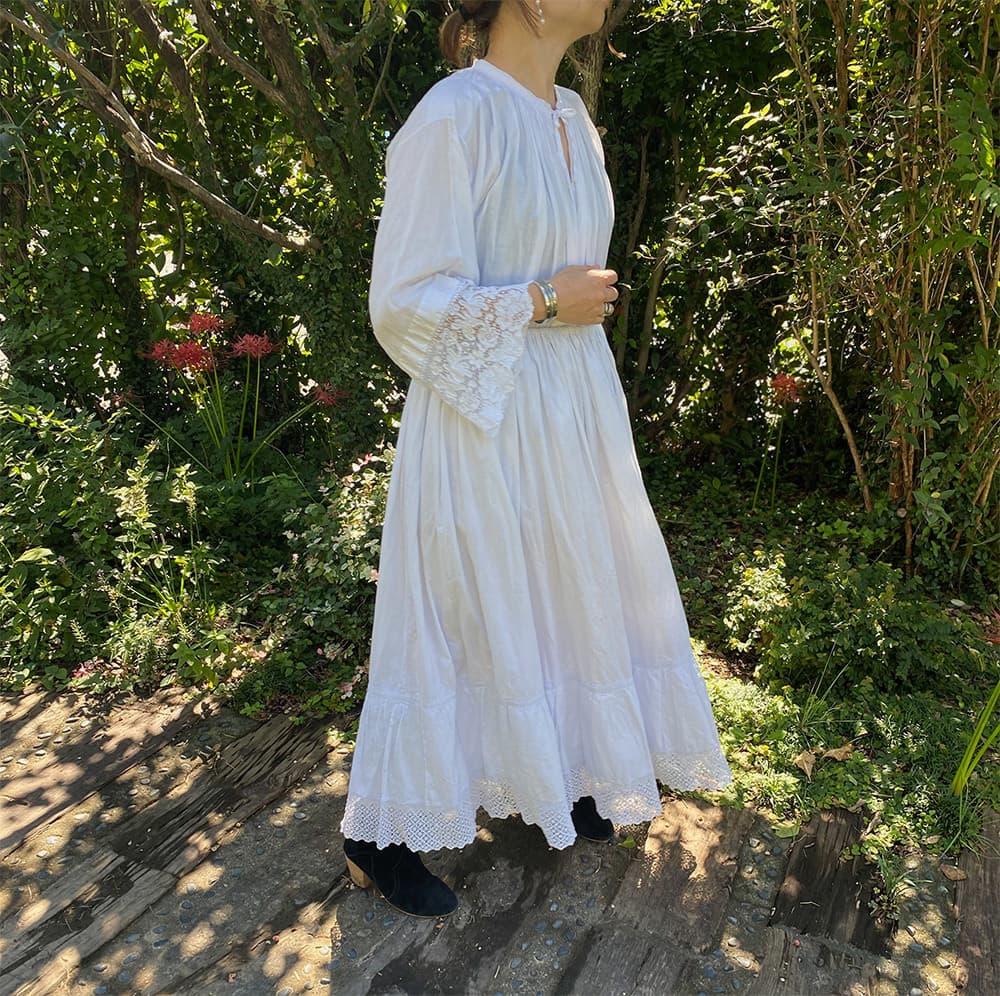 たっぷりのギャザー、裾に施された手編みレースが豪華なデザイン。
