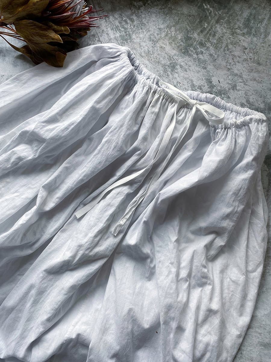 ボリュームがあり、シルエットがとても綺麗です。ウエスト部分にはコットンリボンの紐が付いており、お好きなウエストサイズに絞ってリボン結びで留めて着用いただけます。