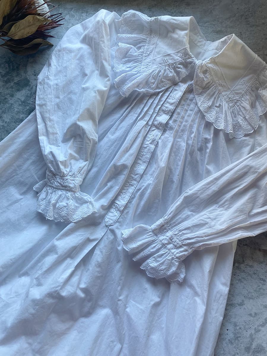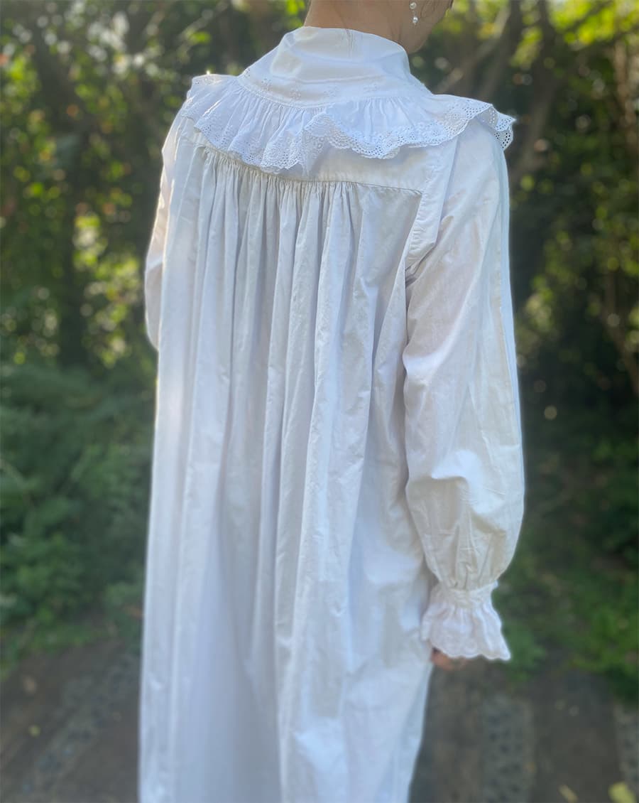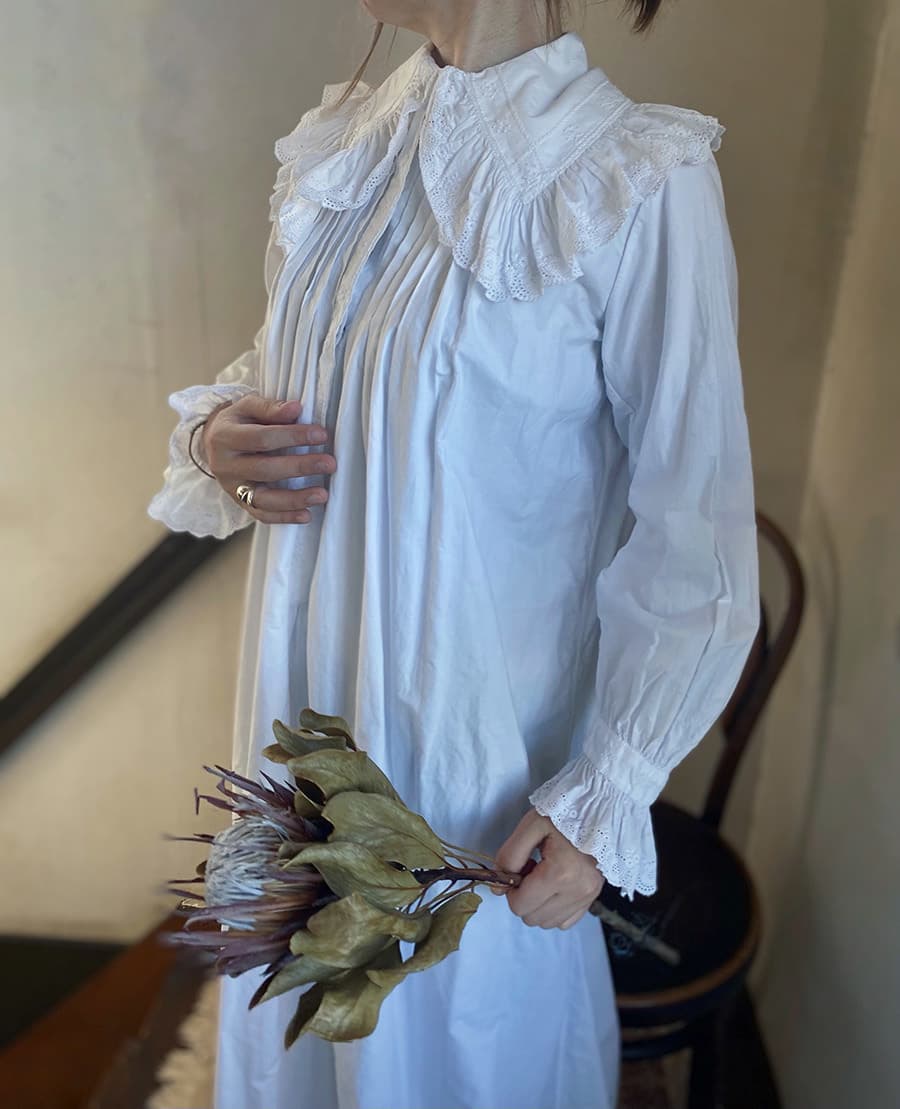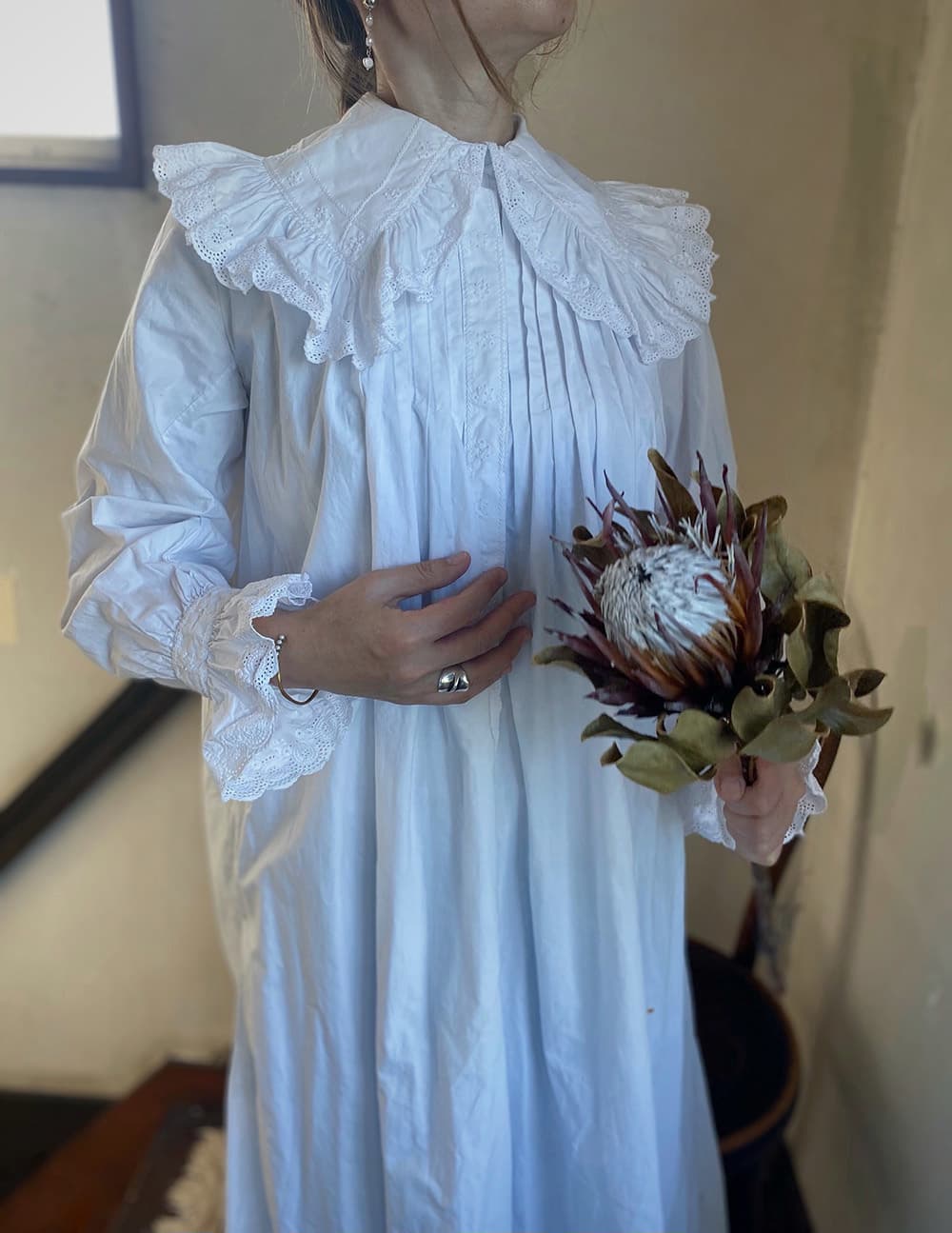 数あるナイトドレスの中でもひときわ豪華で希少なデザイン。大きな襟を出してニットやジャケットなどと重ね着もおすすめ。コーディネートが可愛く決まる一枚です。