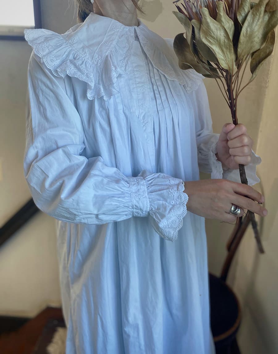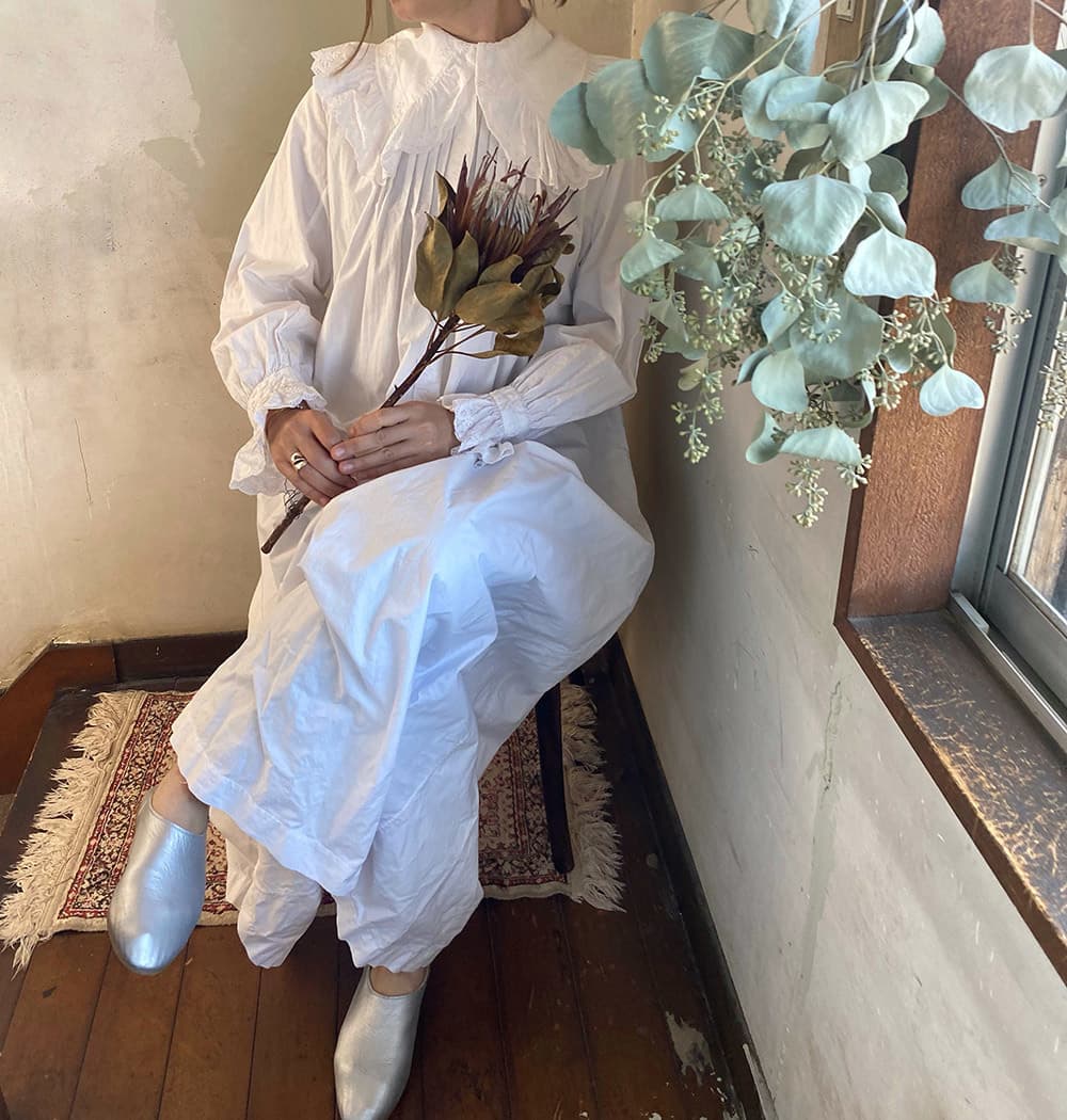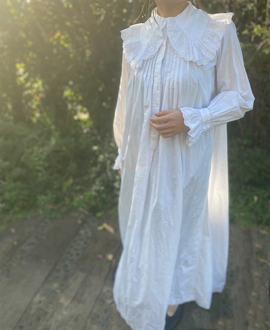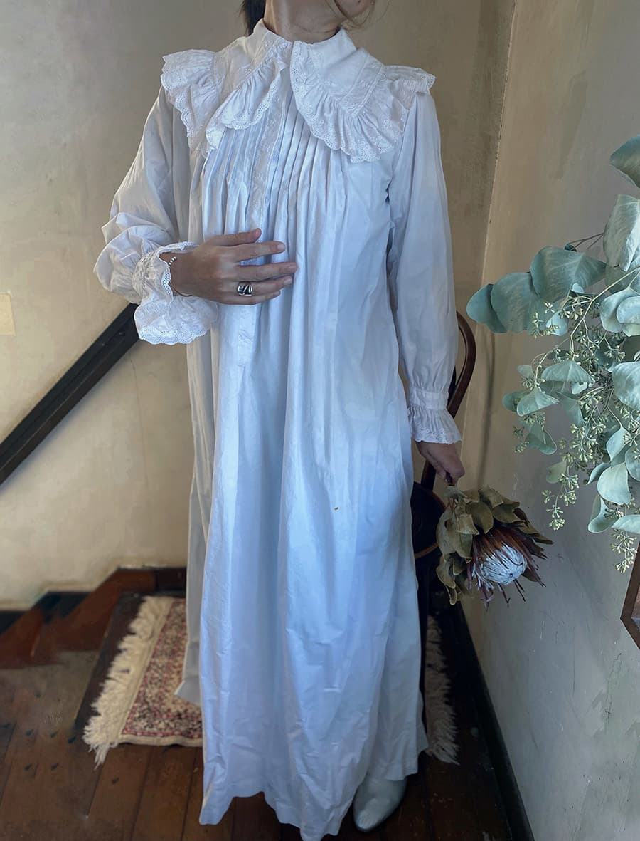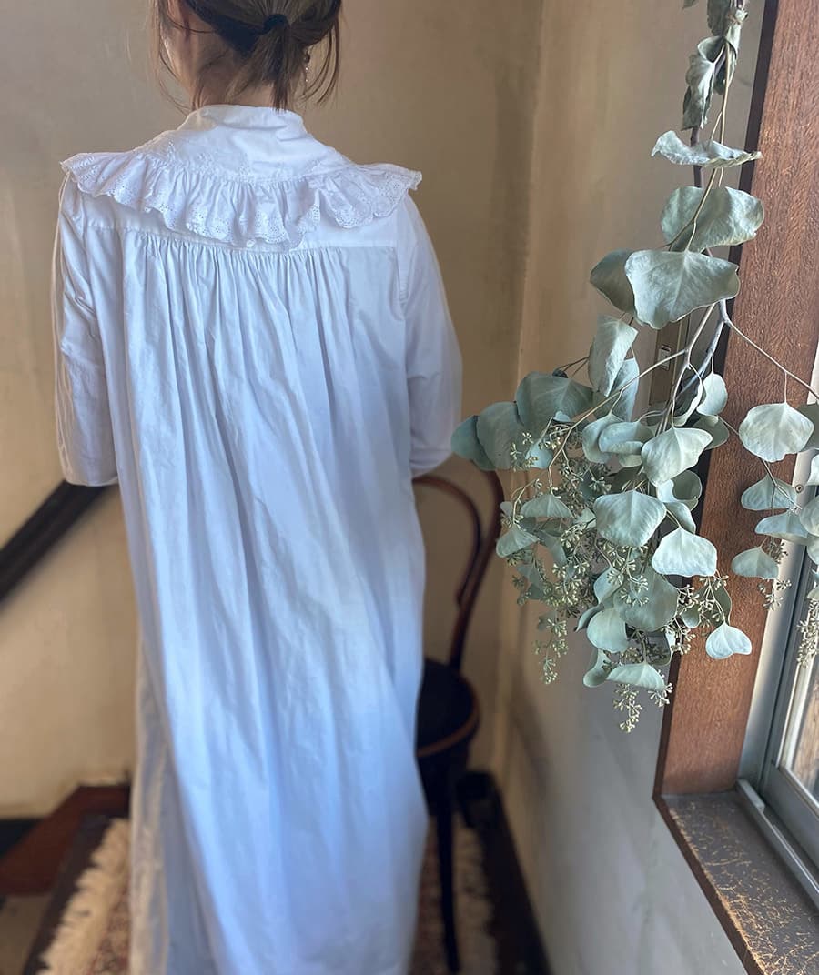 数あるナイトドレスの中でもひときわ豪華で希少なデザイン。大きな襟を出してニットやジャケットなどと重ね着もおすすめ。コーディネートが可愛く決まる一枚です。