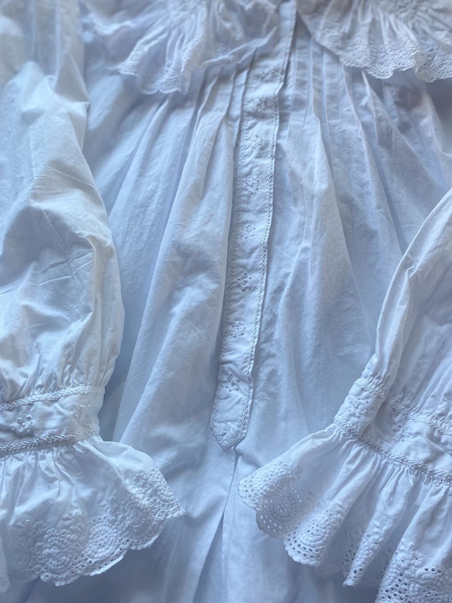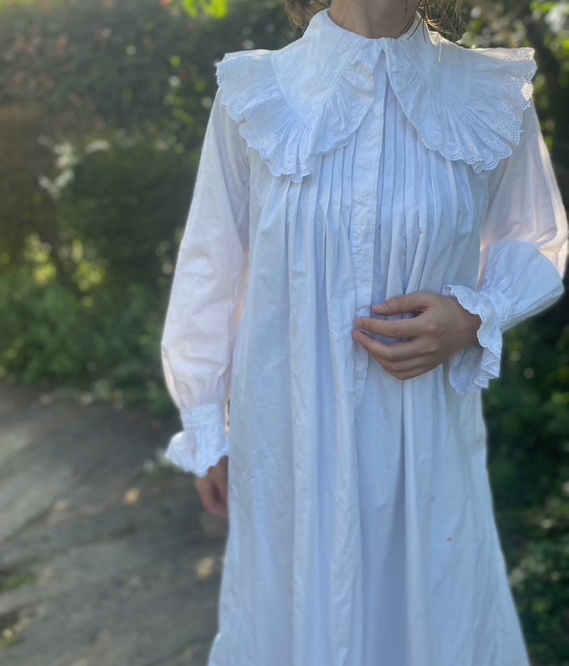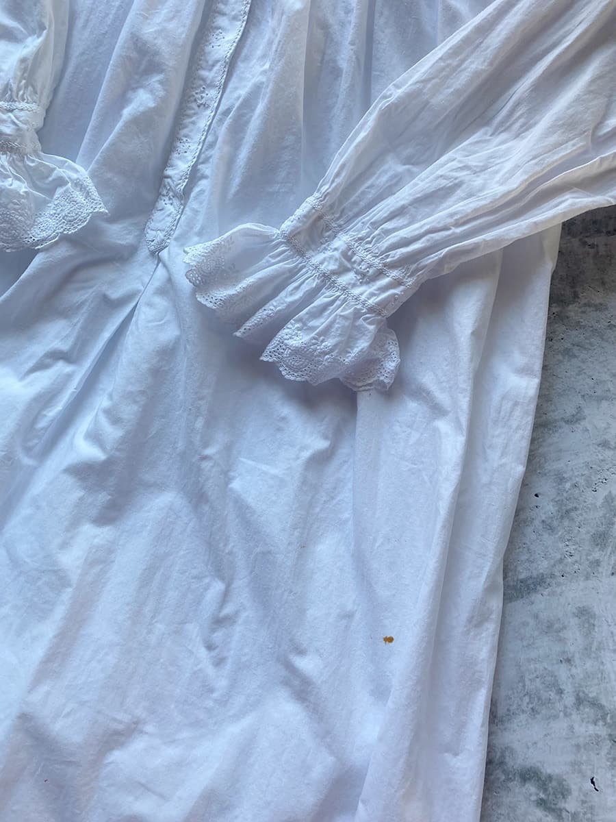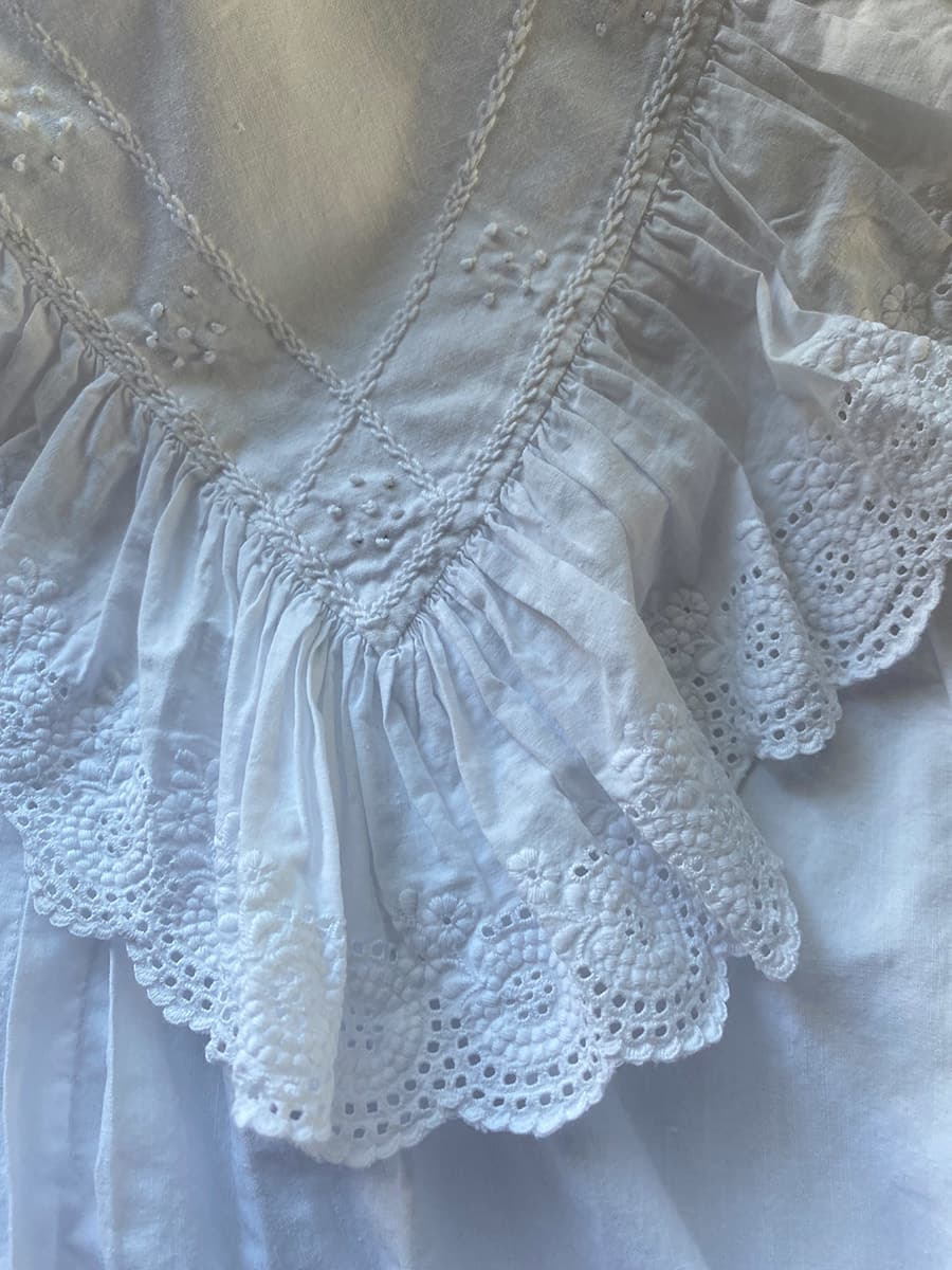 大きな襟がポイントの刺繍が贅沢に施された1900年代フレンチアンティークナイトドレス。