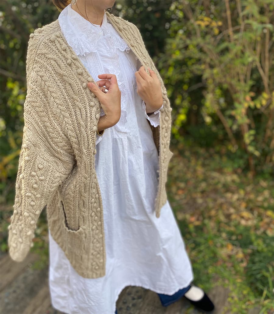 襟とお袖、ボタン周りのカットワークレース、ピンタック、手縫い刺繍が大変美しく、一枚でさまになるワンピースです。