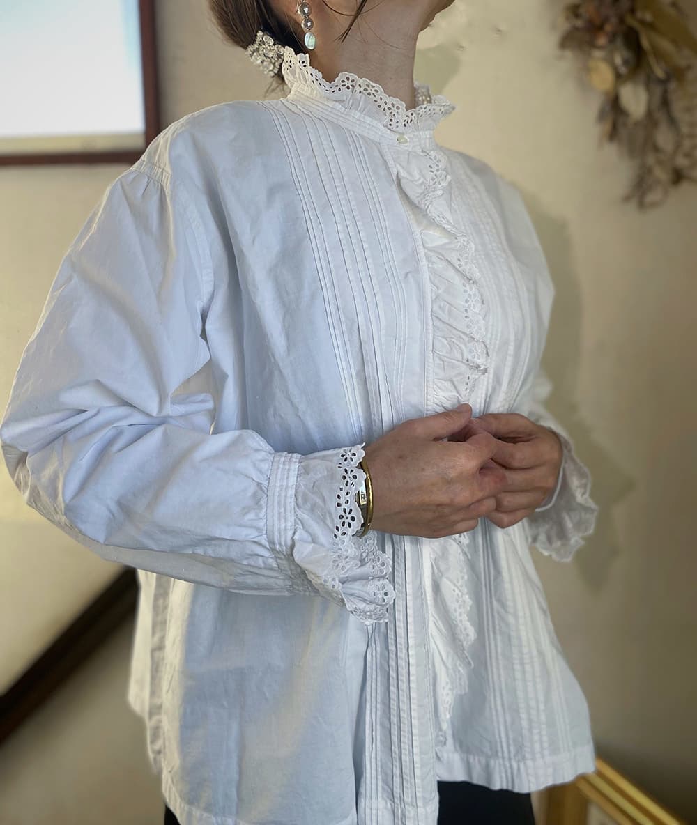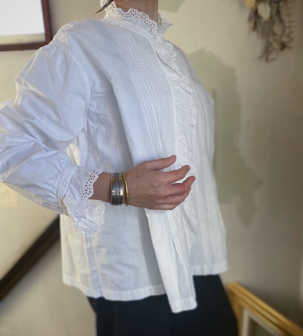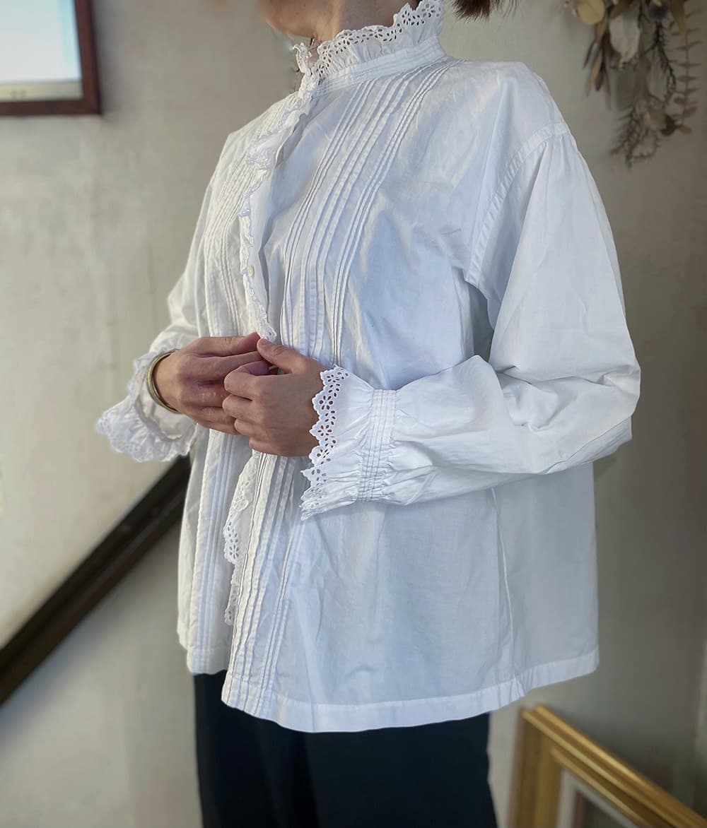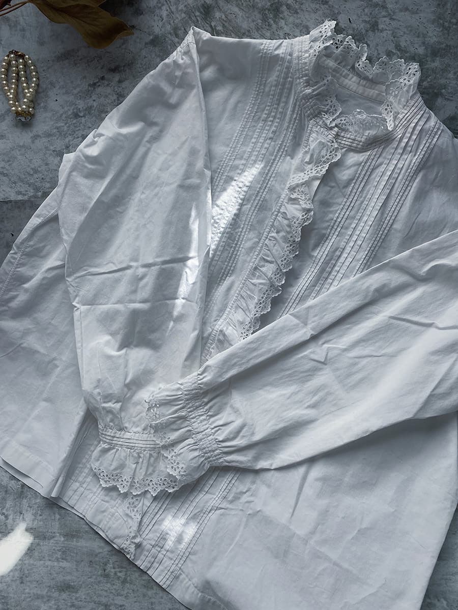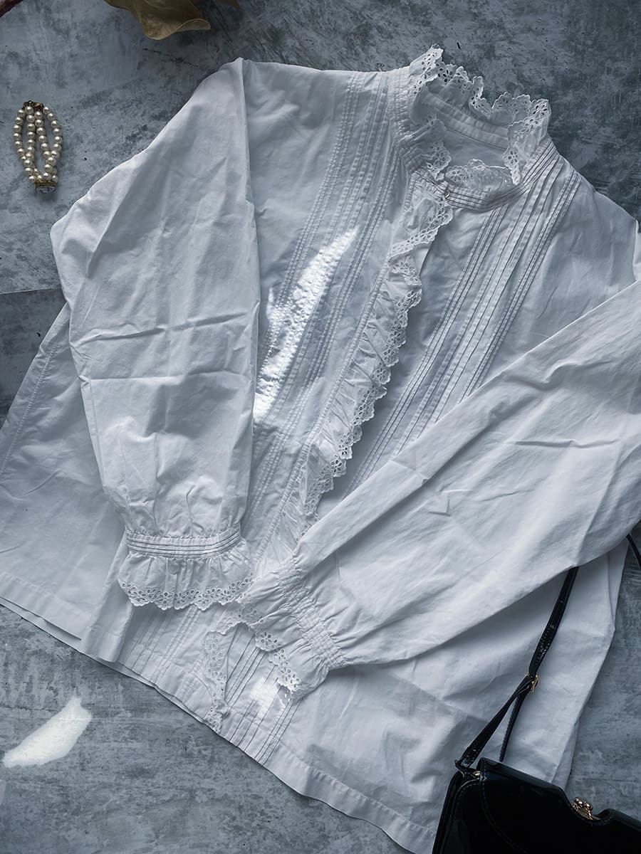 スタンドカラーの襟がクラシカルでシックなイメージです。お花模様のスカラップレースが襟と袖、フロントにたっぷり施され、とても可愛いデザインのブラウスとなっております。