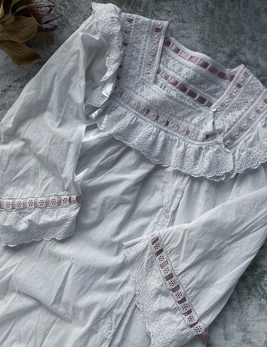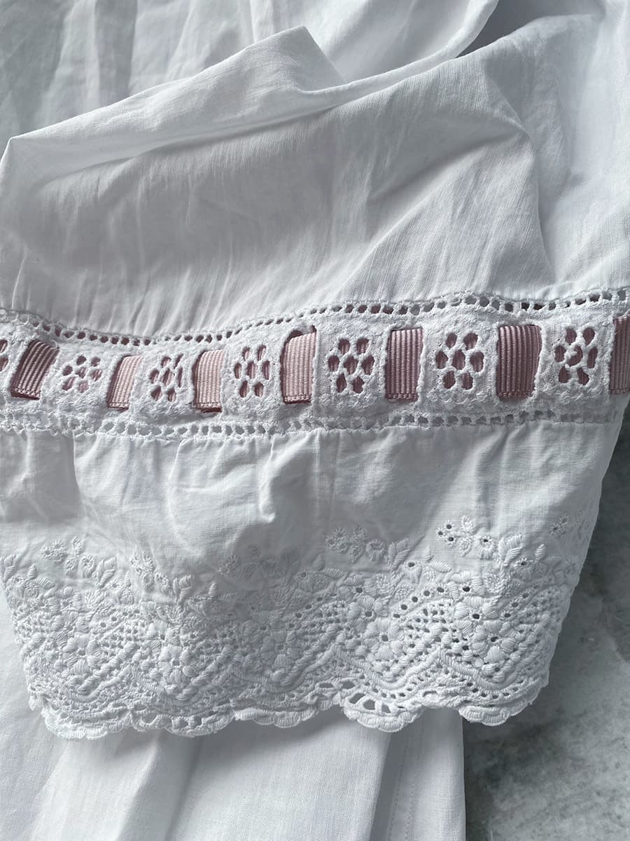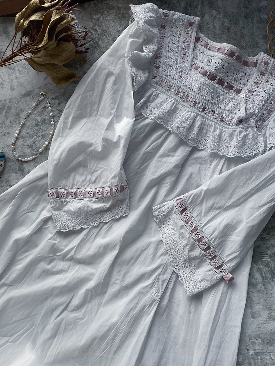 大変美しいレースとくすんだピンクのリボンが可愛らしい1900年代フレンチアンティークナイトドレス。