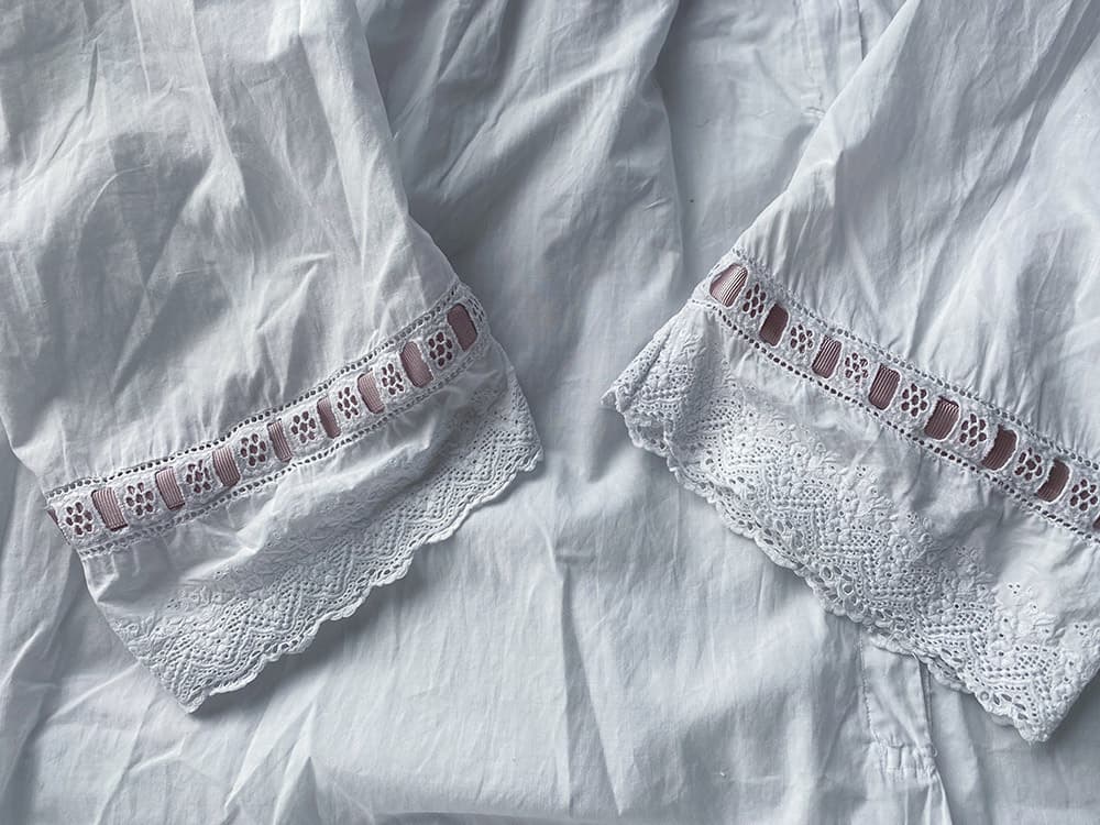 ゴージャスな襟とお袖、ピンクのリボンが可愛いフレンチアンティークナイトドレス