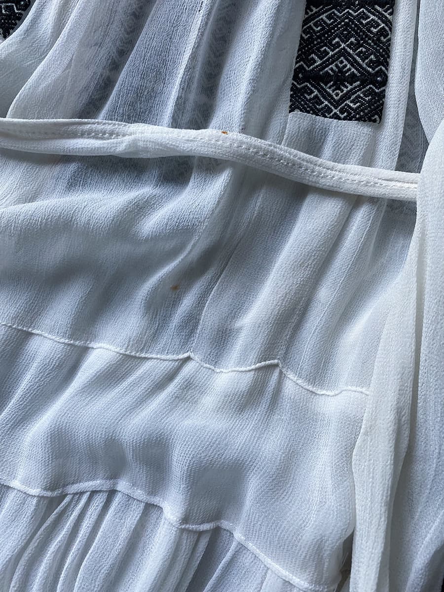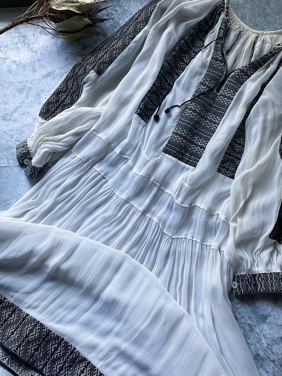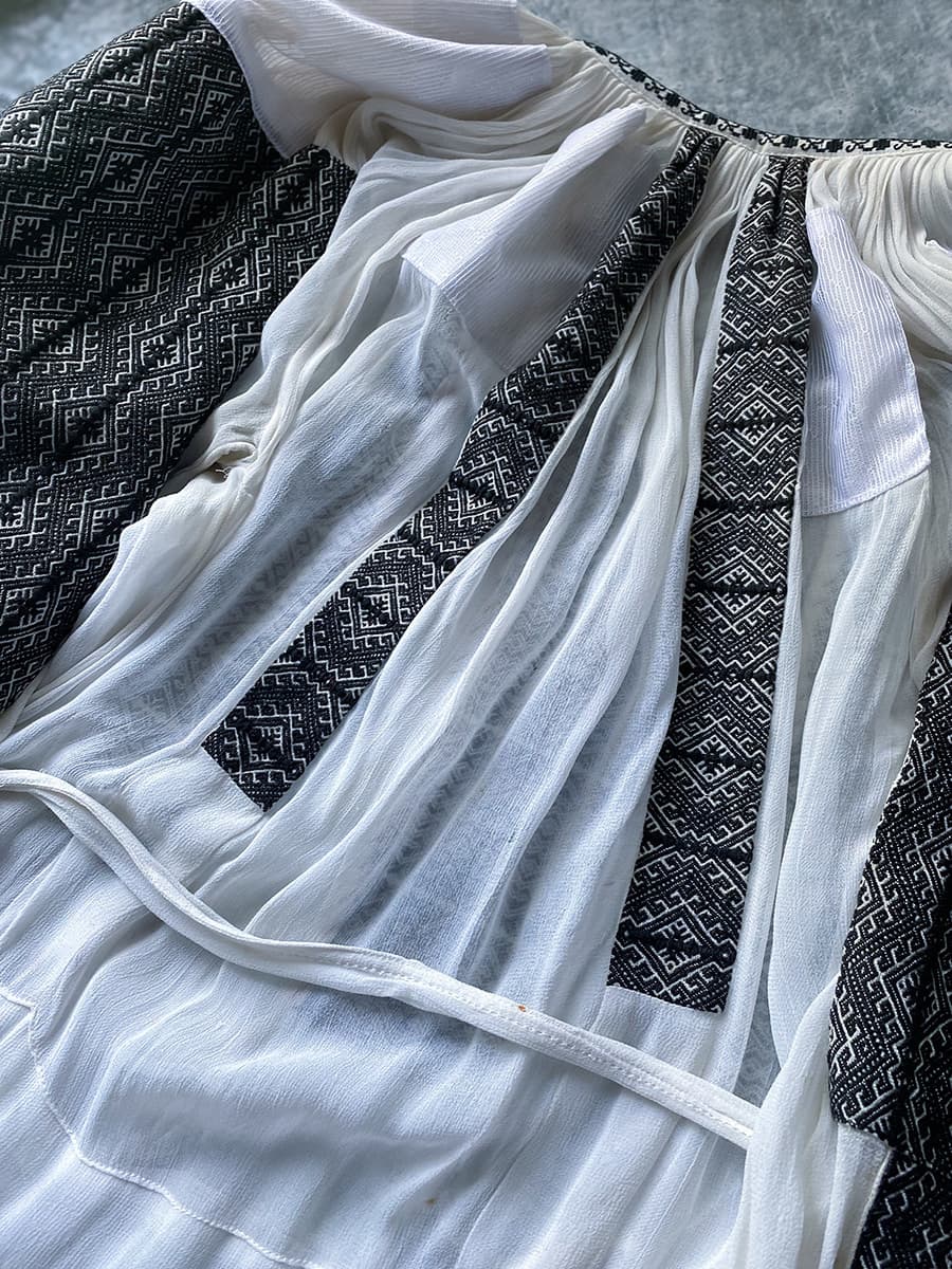 1900年代ルーマニア刺繍ワンピースです。シアーな質感のガーゼコットンのドレスはひらっとしたシルエットがとても綺麗です。ブラックの刺繍がびっしりと施された豪華で美しいデザイン。