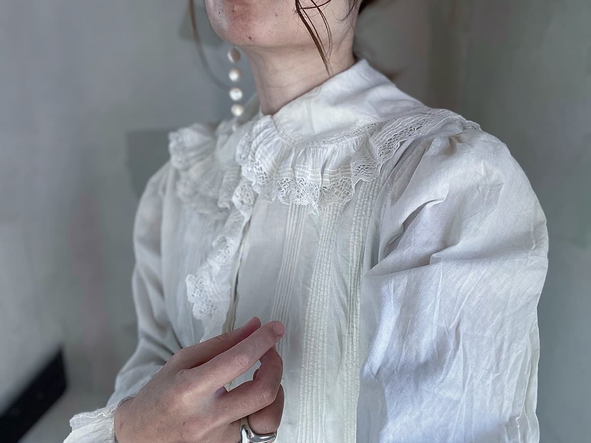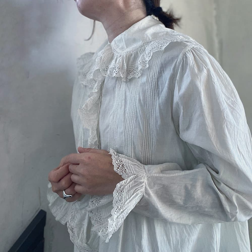 大きな襟と袖、ボタン周りのフロントにフリルレースが付いていて、フロントはボタンで開閉できる仕様となっております。