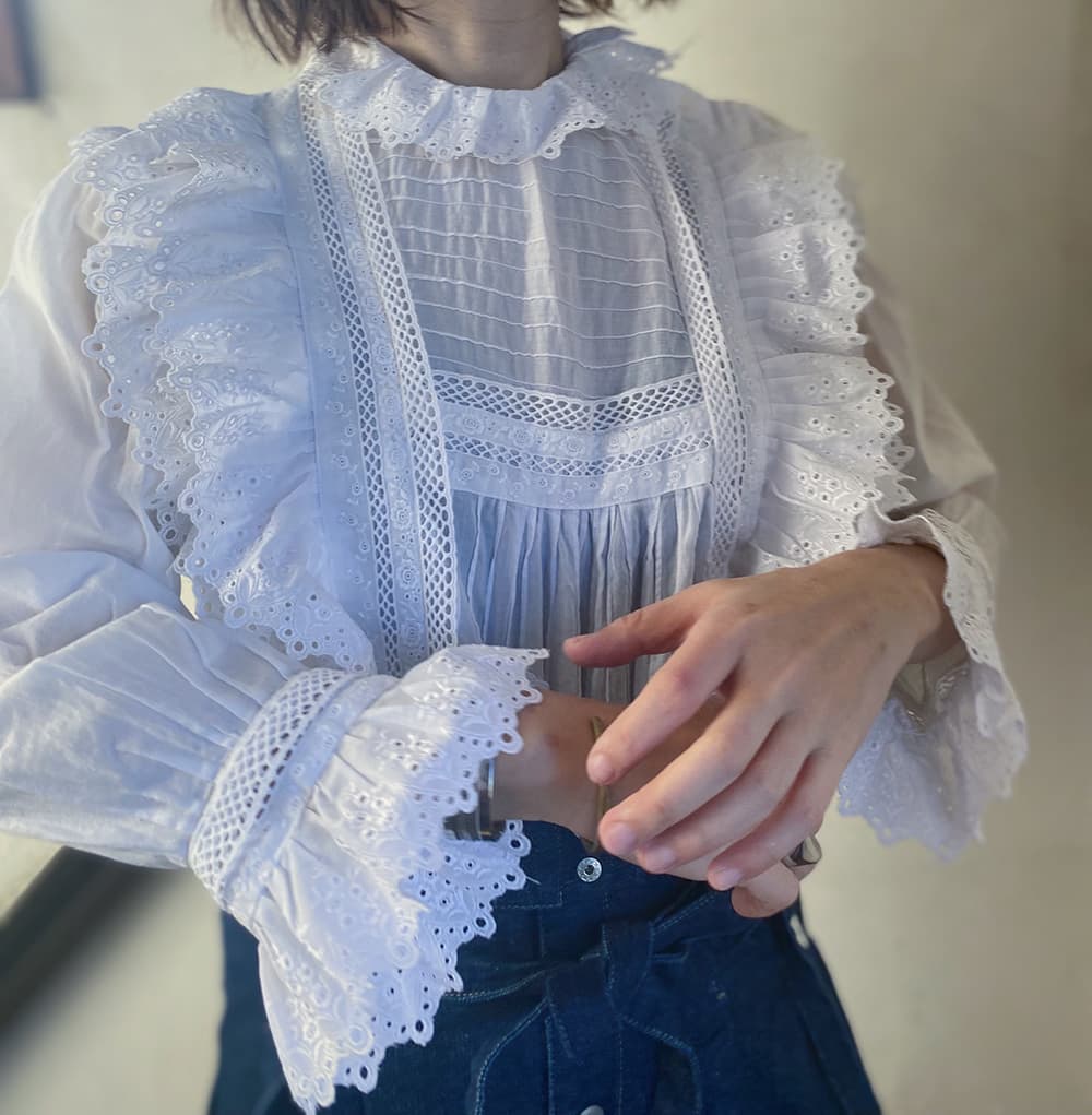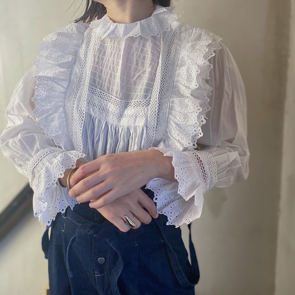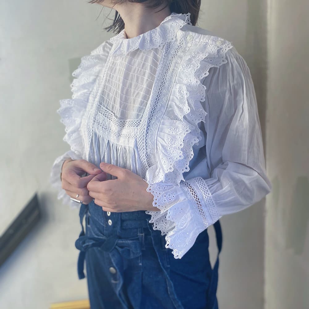 フリルレースの丸襟が可愛らしいヴィンテージコットンブラウス。