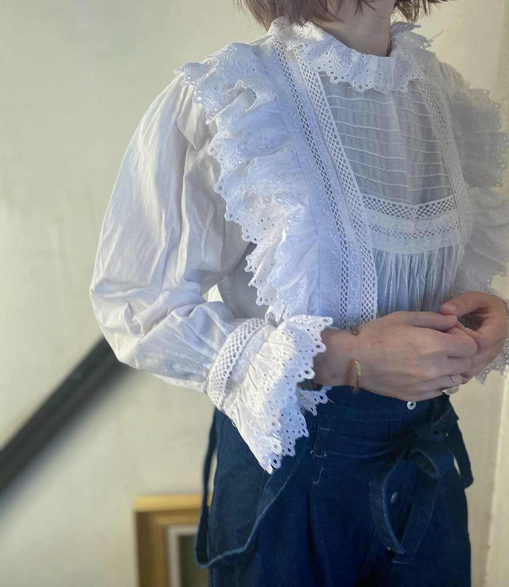 襟元と袖のフリルレース使いが素敵なヴィンテージブラウス