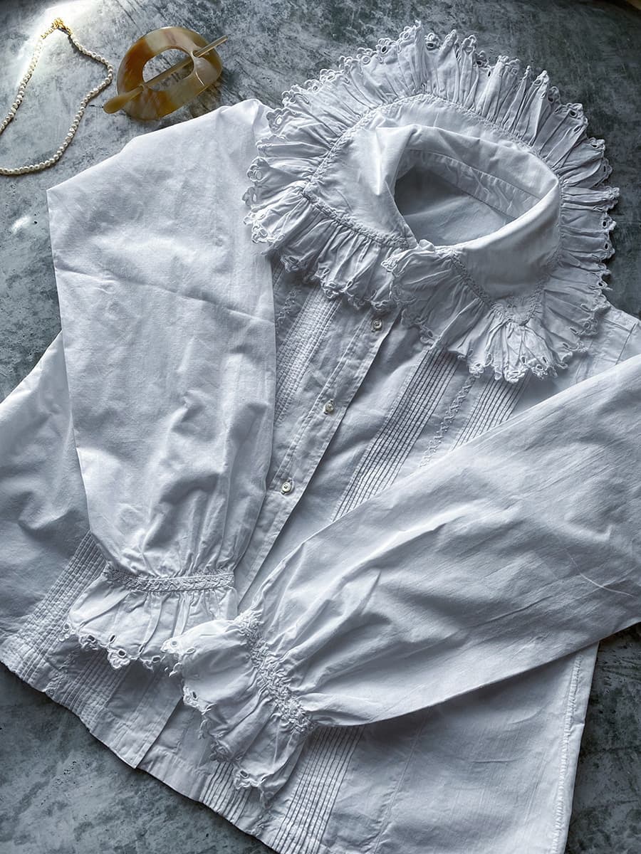 大きなフリルレースカラー、ピンタックが贅沢なフレンチアンティークブラウス