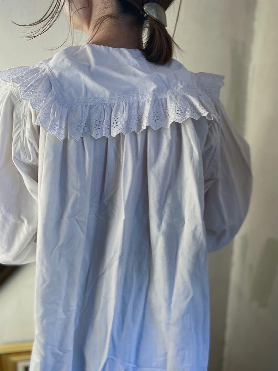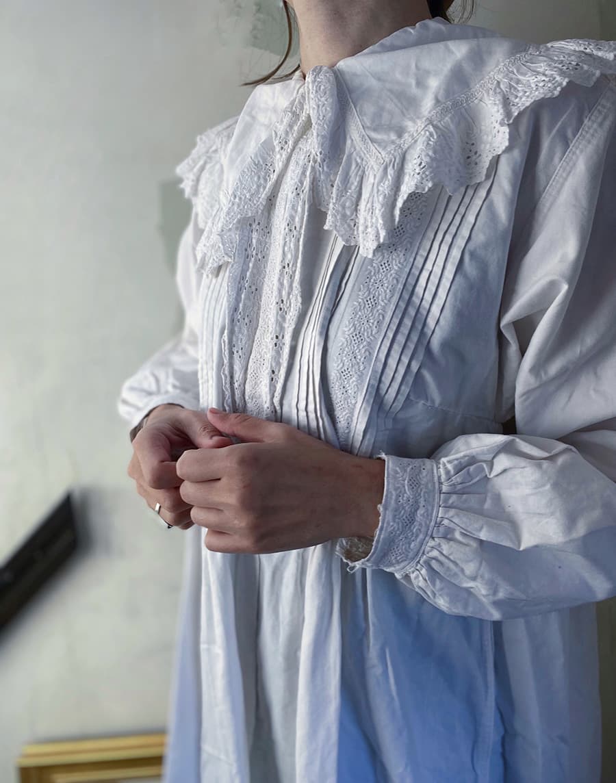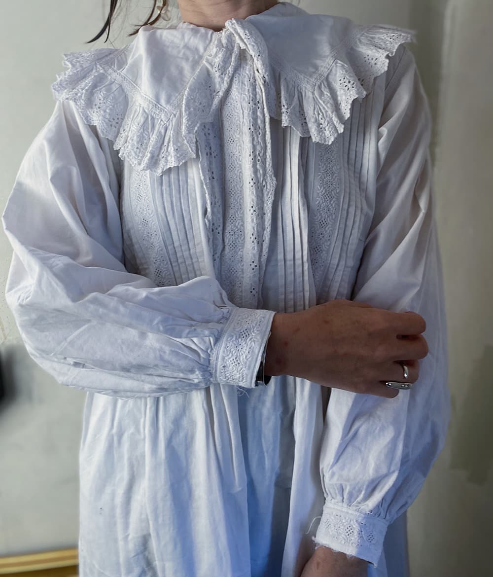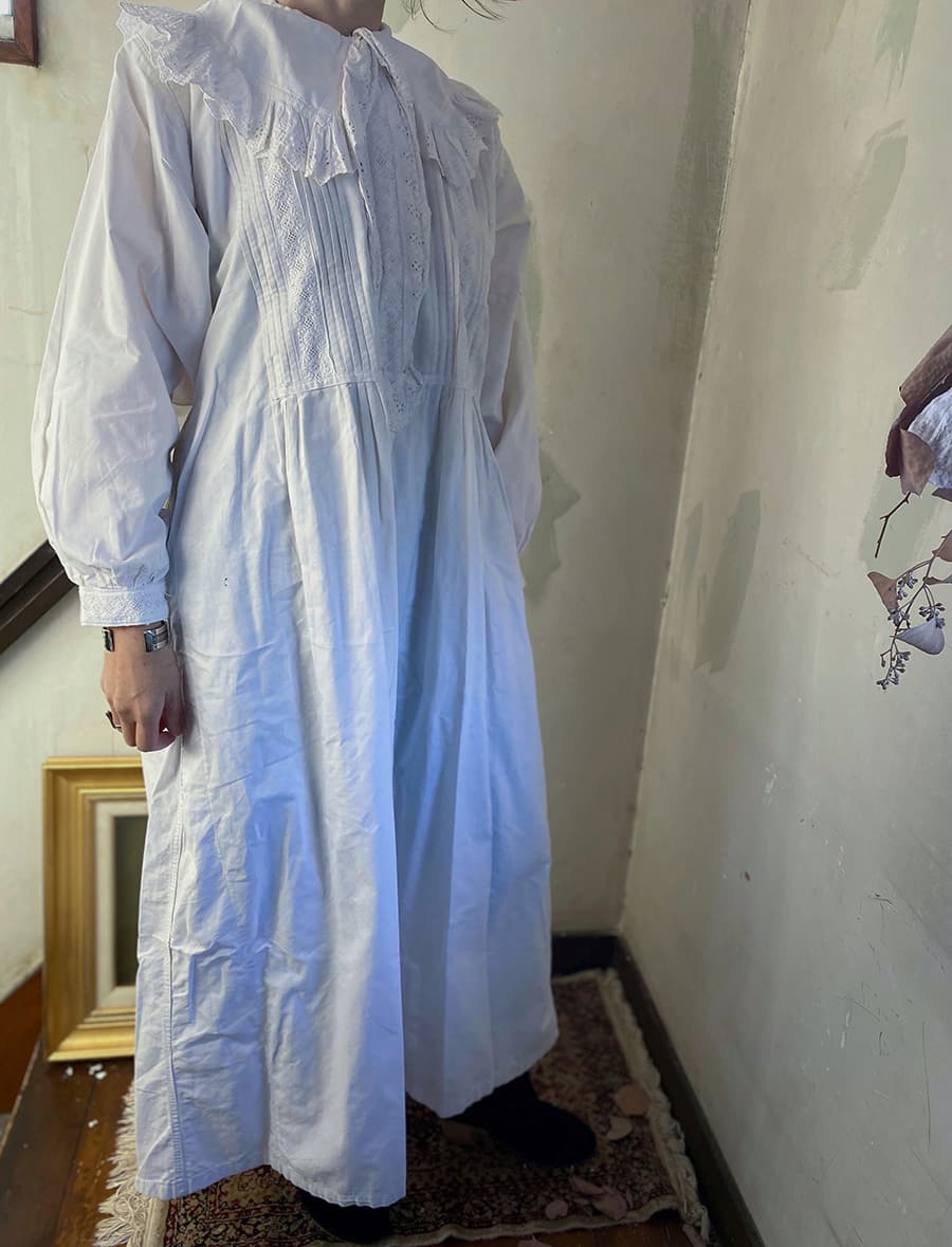 大きな襟とスカラップレースが可愛らしいアンティークナイトドレス。